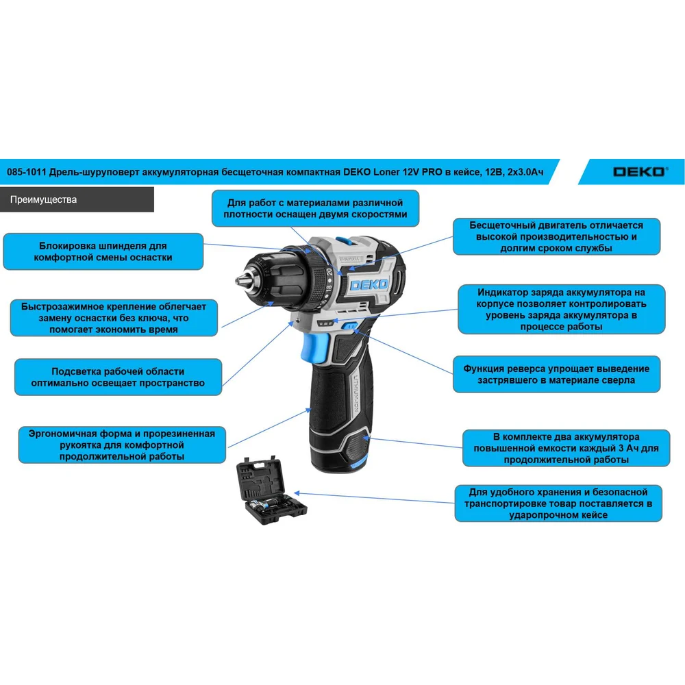Купить Аккумуляторная бесщеточная компактная дрель-шуруповерт DEKO Loner 12V PRO в кейсе, 12В, 2x3.0Ач 085-1011 по лучшей цене с доставкой - интернет магазин №1 в России