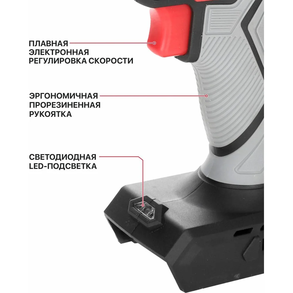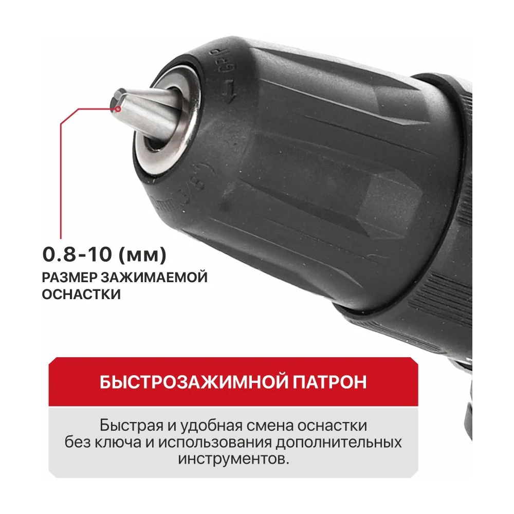 Комплектация Дрель аккумуляторная,; коробка,; магнитный адаптер,; сверло по дереву,; сверло по металлу,; набор бит (10 шт),; руководство по эксплуатации
