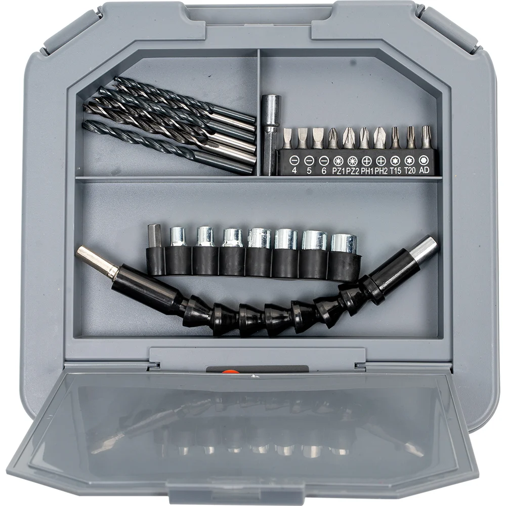 Комплектация Дрель - 1 шт; Аккумуляторная батарея - 2 шт; Зарядное устройство - 1 шт; Гибкий вал - 1 шт; Набор сверл - 6 шт; Набор бит - 6 шт; Набор накидных головок - 7 шт; Переходник - 2 шт; Руководство по эксплуатации - 1 шт; Упаковка (кейс пластиковый) - 1 шт