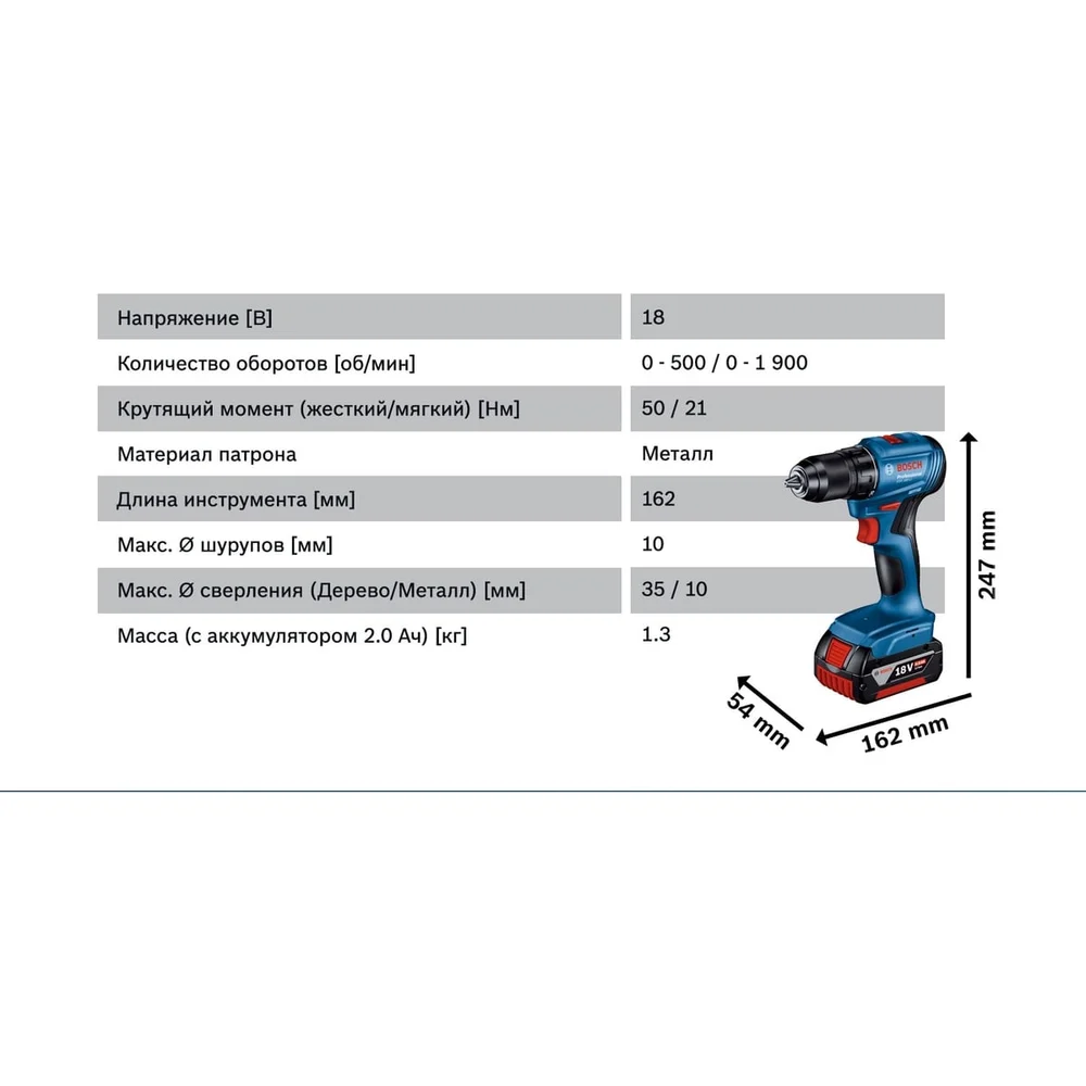 Комплектация Шуруповерт GSR 185-LI; Аккумулятор GBA 18V 2,0 Ач - 2 шт; Зарядное устройство GAL 18V-20; Инструкция по эксплуатации; Кейс