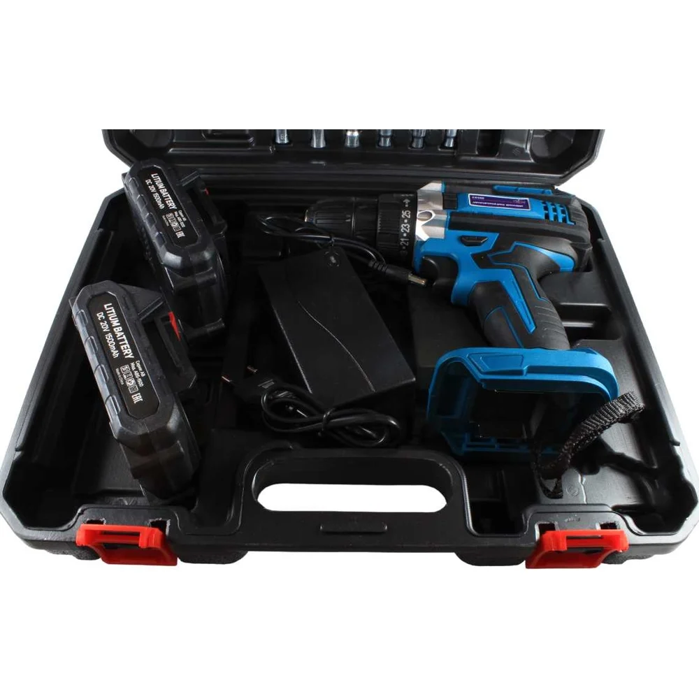 Комплектация Дрель-шуруповерт, 2 аккумулятора, зарядное устройство, биты, сверла, гибкий удлинитель, кейс