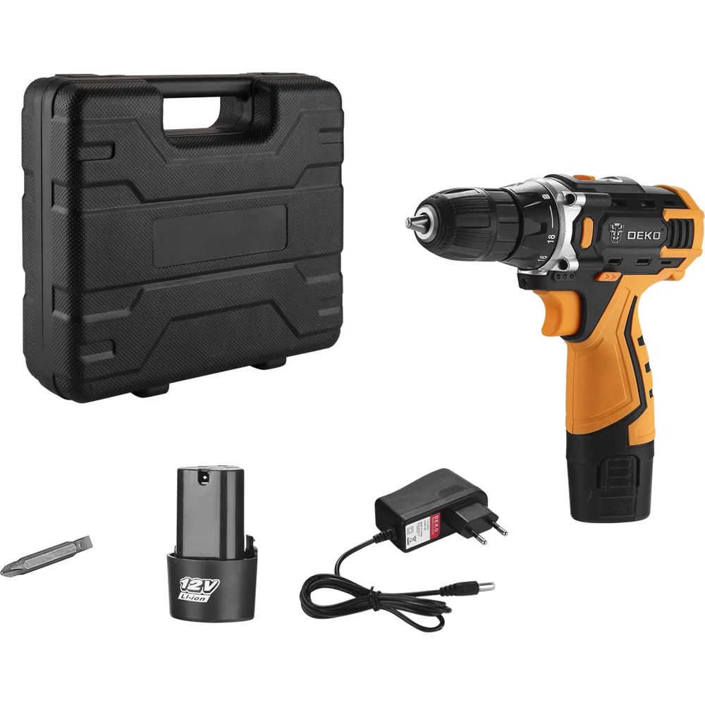 Комплектация Аккумуляторная дрель-шуруповерт DEKO Banger 12V; Аккумулятор - 2 шт; Бита; Зарядное устройство; Руководство по эксплуатации; Кейс