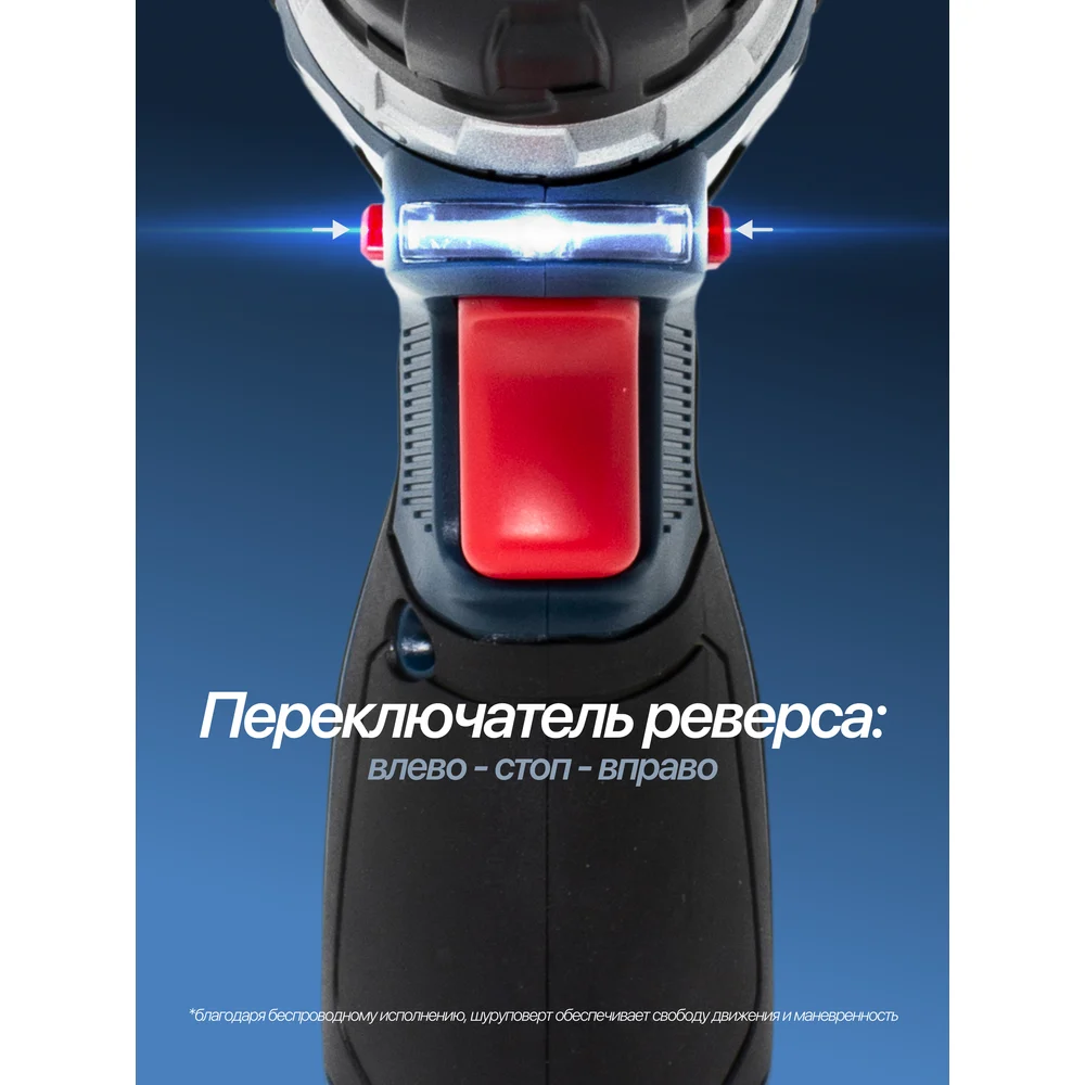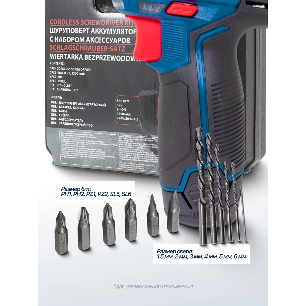 Комплектация Аккумуляторный шуруповерт; Li-ion аккумулятор: 2 шт; Зарядное устройство; Сверло 1.5, 2, 3, 4, 5, 6 мм; Биты PH1,2 PZ1,2,SL5,6; Битодержатель; Кейс