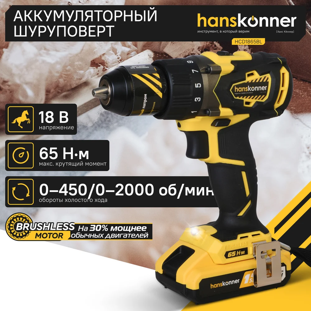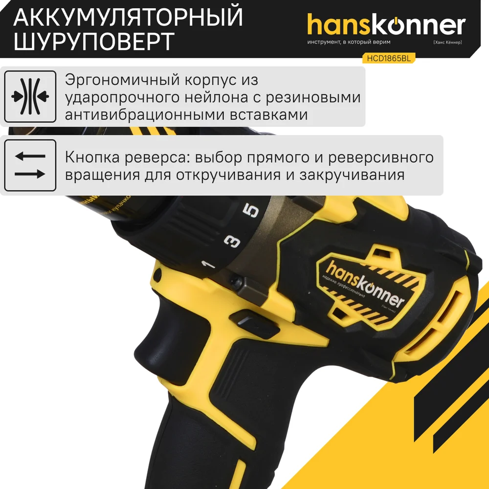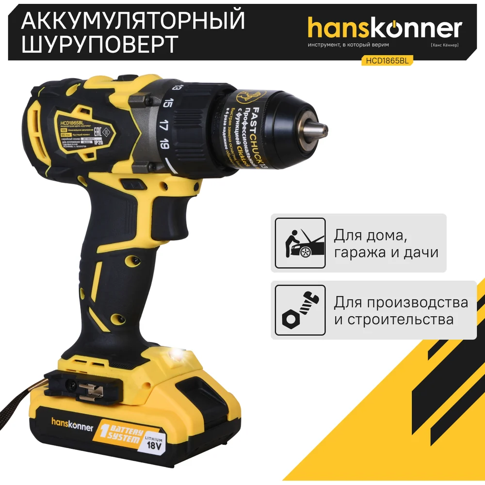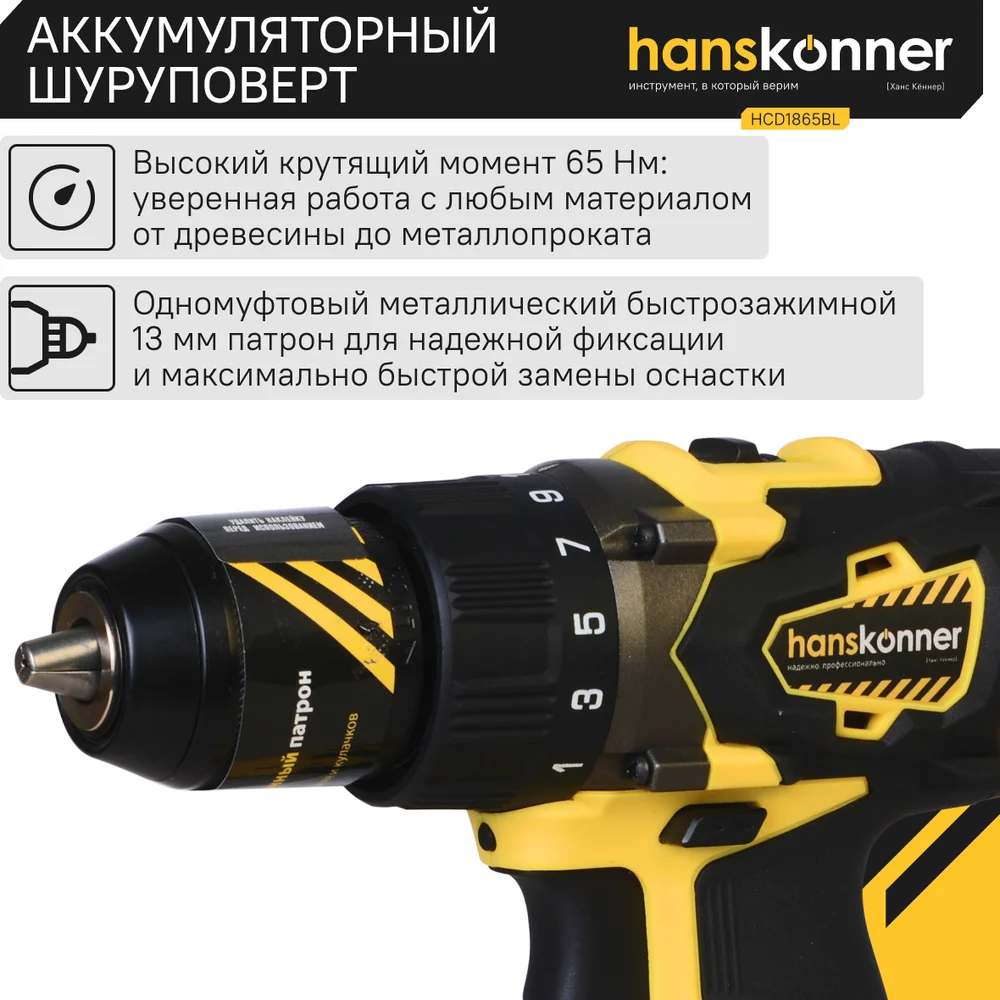 Купить Аккумуляторная дрель-шуруповерт Hanskonner HCD1865BL по лучшей цене с доставкой - интернет магазин №1 в России