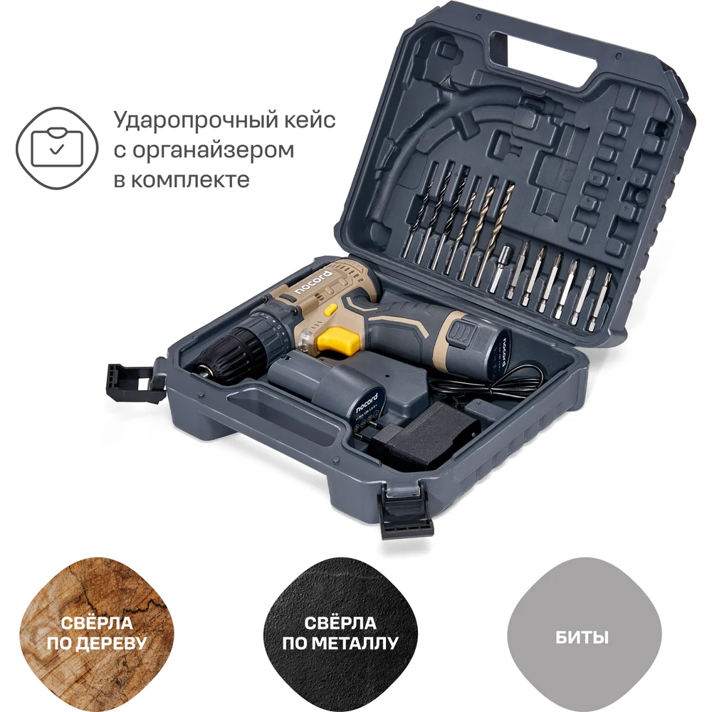 Купить Аккумуляторная дрель-шуруповерт Nocord 12В, 2x1.5 А·ч Li-Ion, в кейсе + 13 предметов оснастки, NCD-12.2.15.C 900194.NCD-12.2.15.C-2 по лучшей цене с доставкой - интернет магазин №1 в России