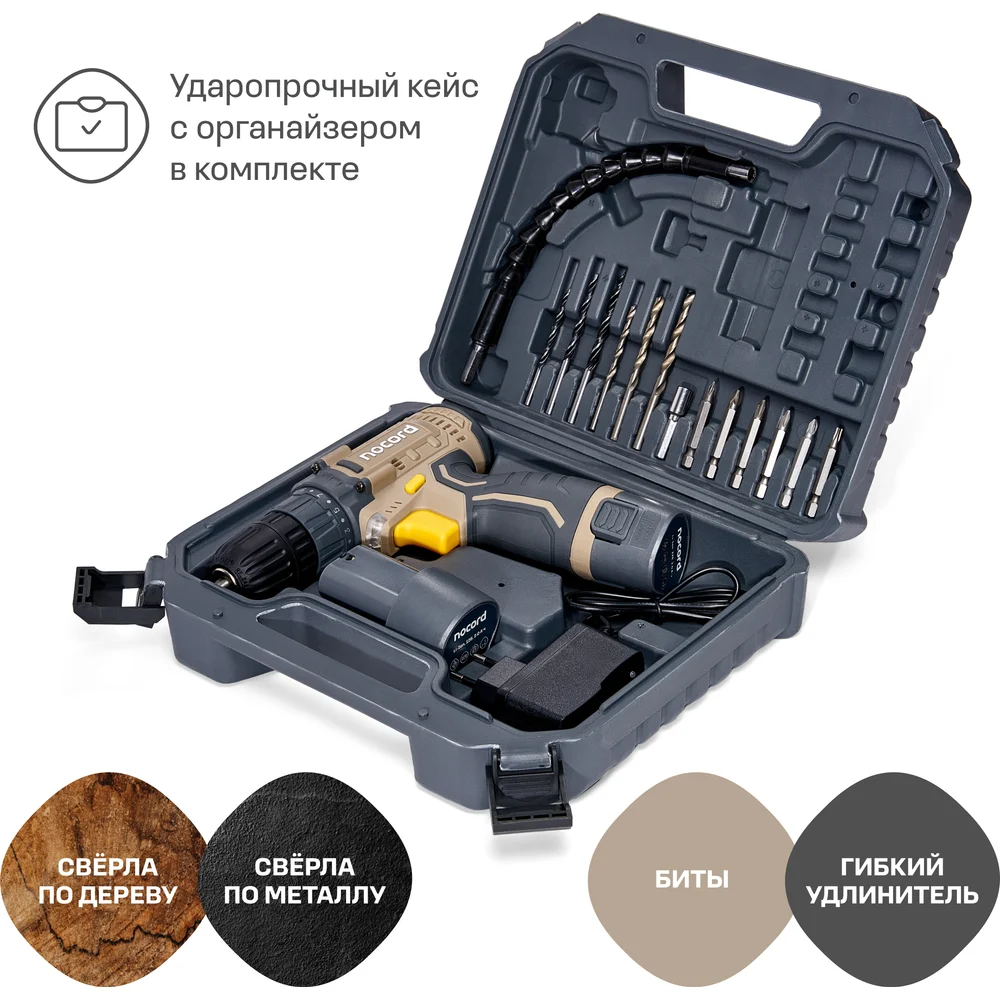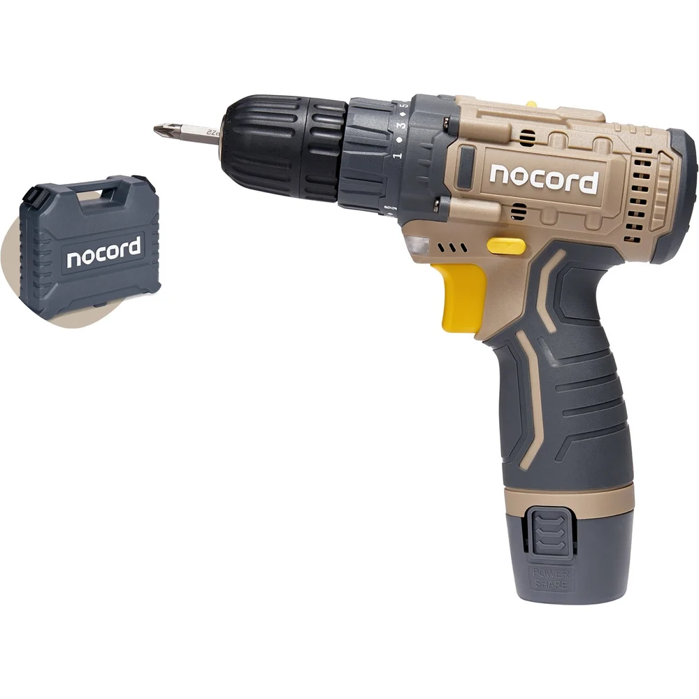 Купить Аккумуляторная дрель-шуруповерт Nocord 12В, 2x2.0 А·ч Li-Ion, в кейсе + 13 предметов оснастки, NCD-12.2.20.C 900194.NCD-12.2.20.C-2 по лучшей цене с доставкой - интернет магазин №1 в России