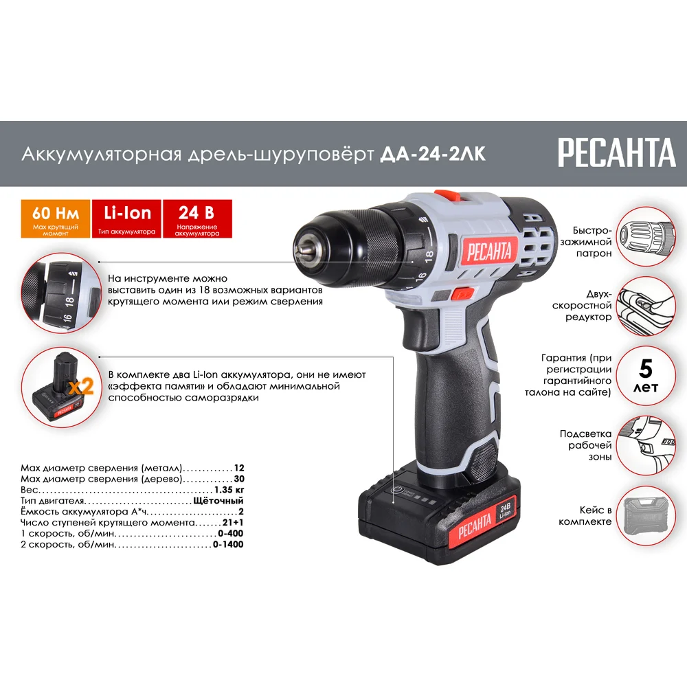Купить Аккумуляторная дрель-шуруповерт Ресанта ДА-24-2ЛК 75/14/7 по лучшей цене с доставкой - интернет магазин №1 в России