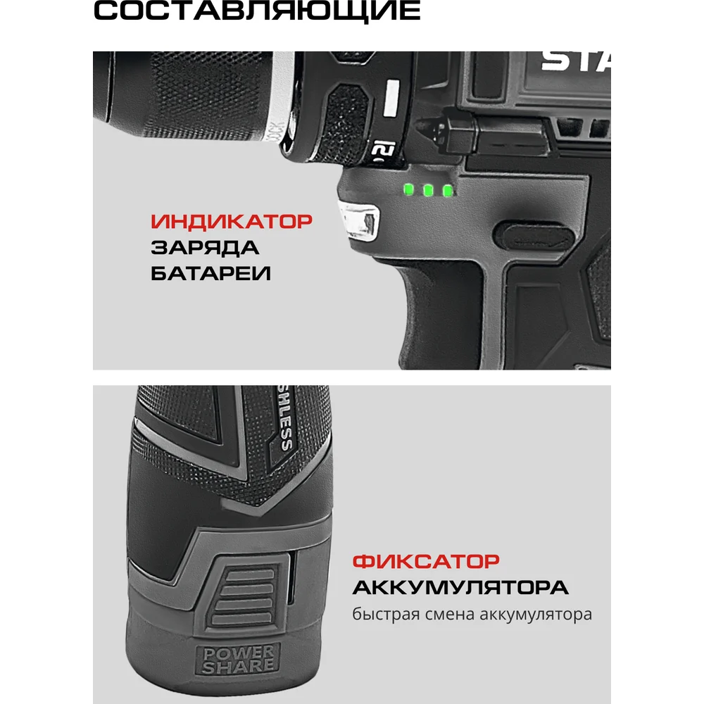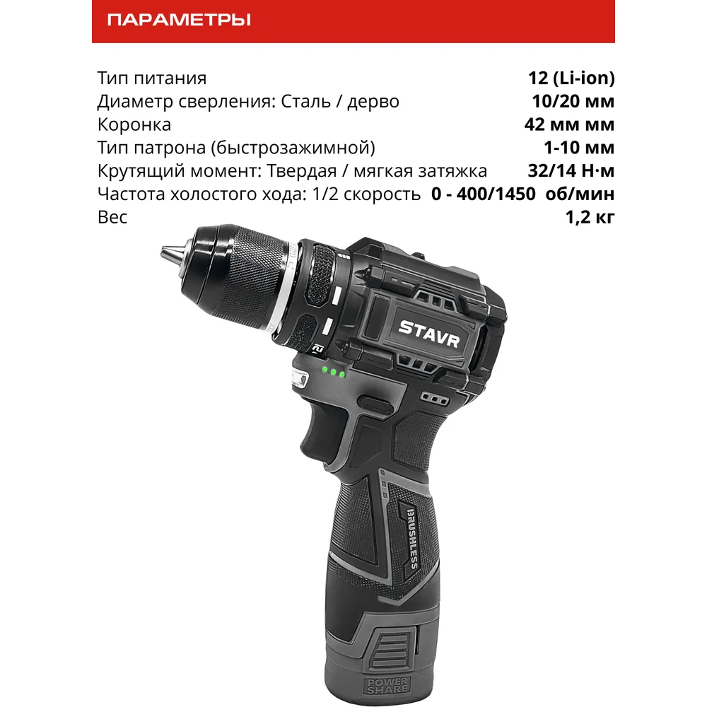 Аккумуляторная дрель-шуруповерт Ставр 12V, BL, 32/14 Нм, Stavr SDD 12BL-2K, БЗП 10мм металл, 0-400/1450 об/мин 9020100403