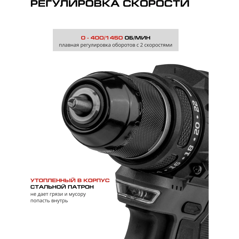 Комплектация Дрель-шуруповерт аккумуляторная – 1 шт; Аккумулятор 2,0 А∙ч – 2 шт; Зарядное устройство – 1 шт; Руководство пользователя – 1 шт; Пластиковый кейс – 1 шт