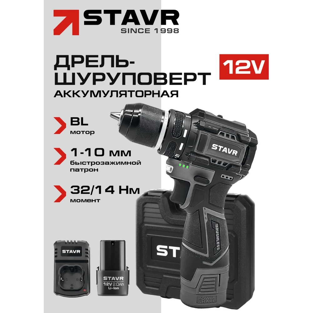 Купить Аккумуляторная дрель-шуруповерт Ставр 12V, BL, 32/14 Нм, Stavr SDD 12BL-2K, БЗП 10мм металл, 0-400/1450 об/мин 9020100403 по лучшей цене с доставкой - интернет магазин №1 в России