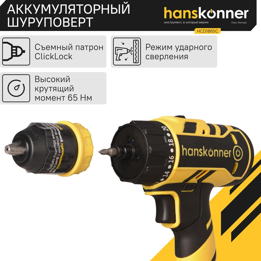 Купить Аккумуляторный шуруповерт Hanskonner HCD1865C по лучшей цене с доставкой - интернет магазин №1 в России