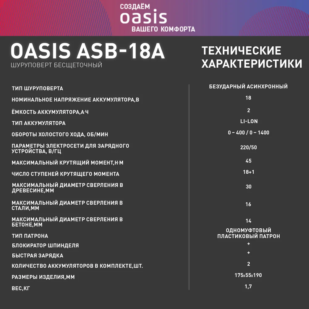 Купить Аккумуляторный шуруповерт OASIS ASB-18A по лучшей цене с доставкой - интернет магазин №1 в России