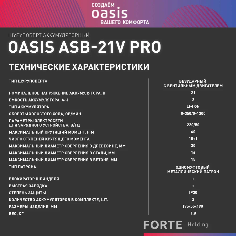 Купить Аккумуляторный шуруповерт OASIS ASB-21V Pro по лучшей цене с доставкой - интернет магазин №1 в России