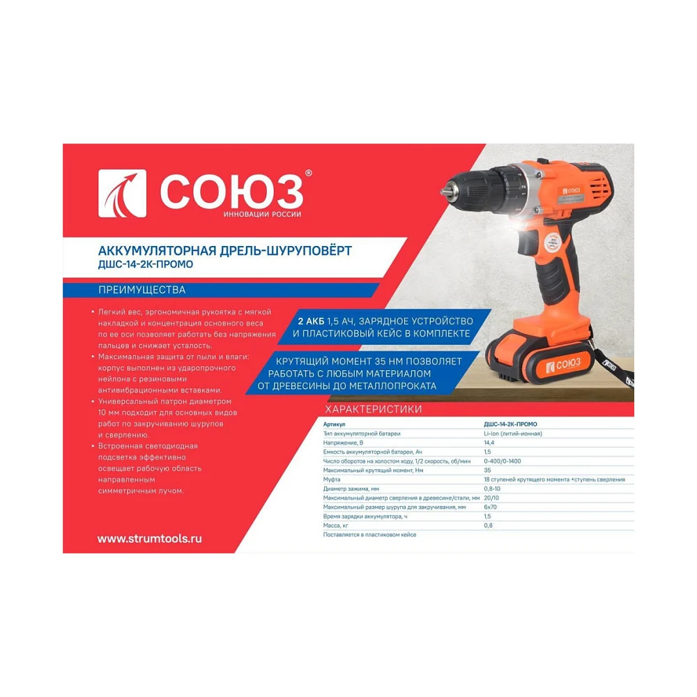 Купить Аккумуляторный шуруповерт Союз ДШС-14-2К-ПРОМО по лучшей цене с доставкой - интернет магазин №1 в России