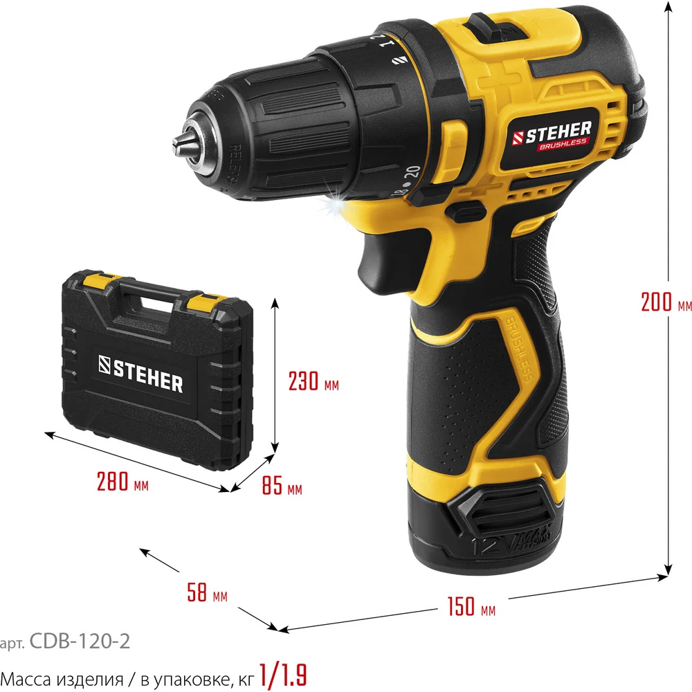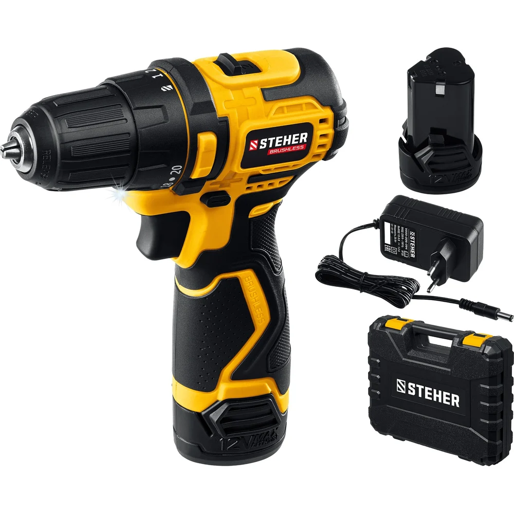 Купить Бесщеточная дрель-шуруповерт STEHER 12 В, 35 Нм, 2 АКБ х 2 Ач, кейс CDB-120-2 по лучшей цене с доставкой - интернет магазин №1 в России