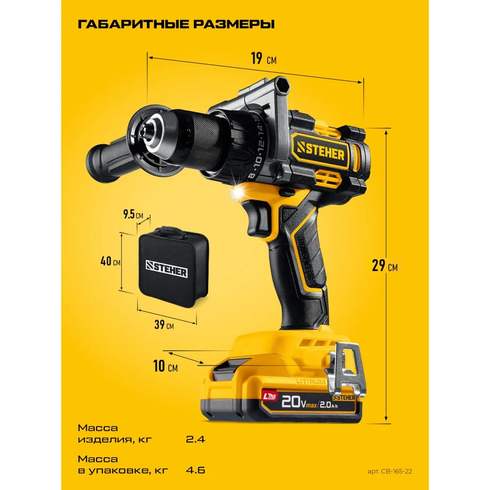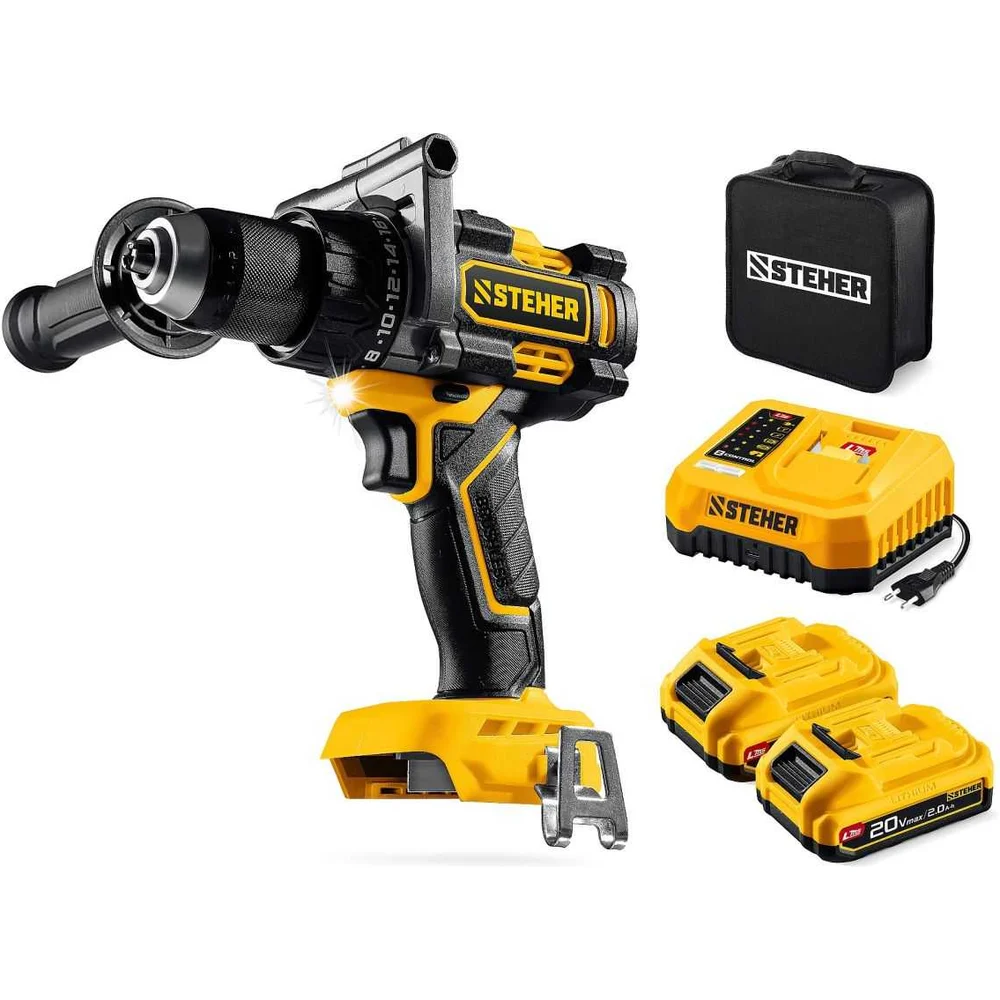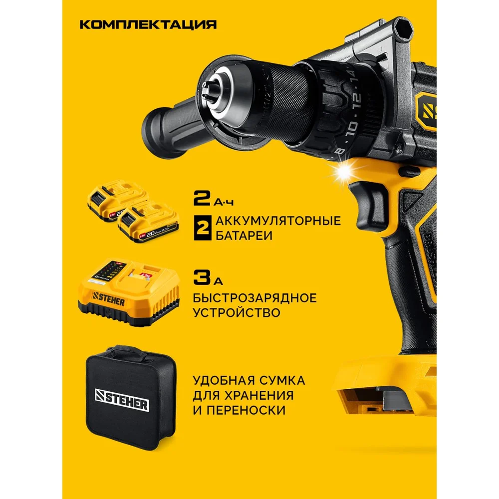 Купить Бесщеточная дрель-шуруповерт STEHER 20 В, 165 Н·м, 2 АКБ LMS (2 А·ч), сумка CB-165-22 по лучшей цене с доставкой - интернет магазин №1 в России