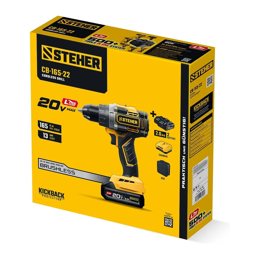 Бесщеточная дрель-шуруповерт STEHER 20 В, 165 Н·м, 2 АКБ LMS (2 А·ч), сумка CB-165-22