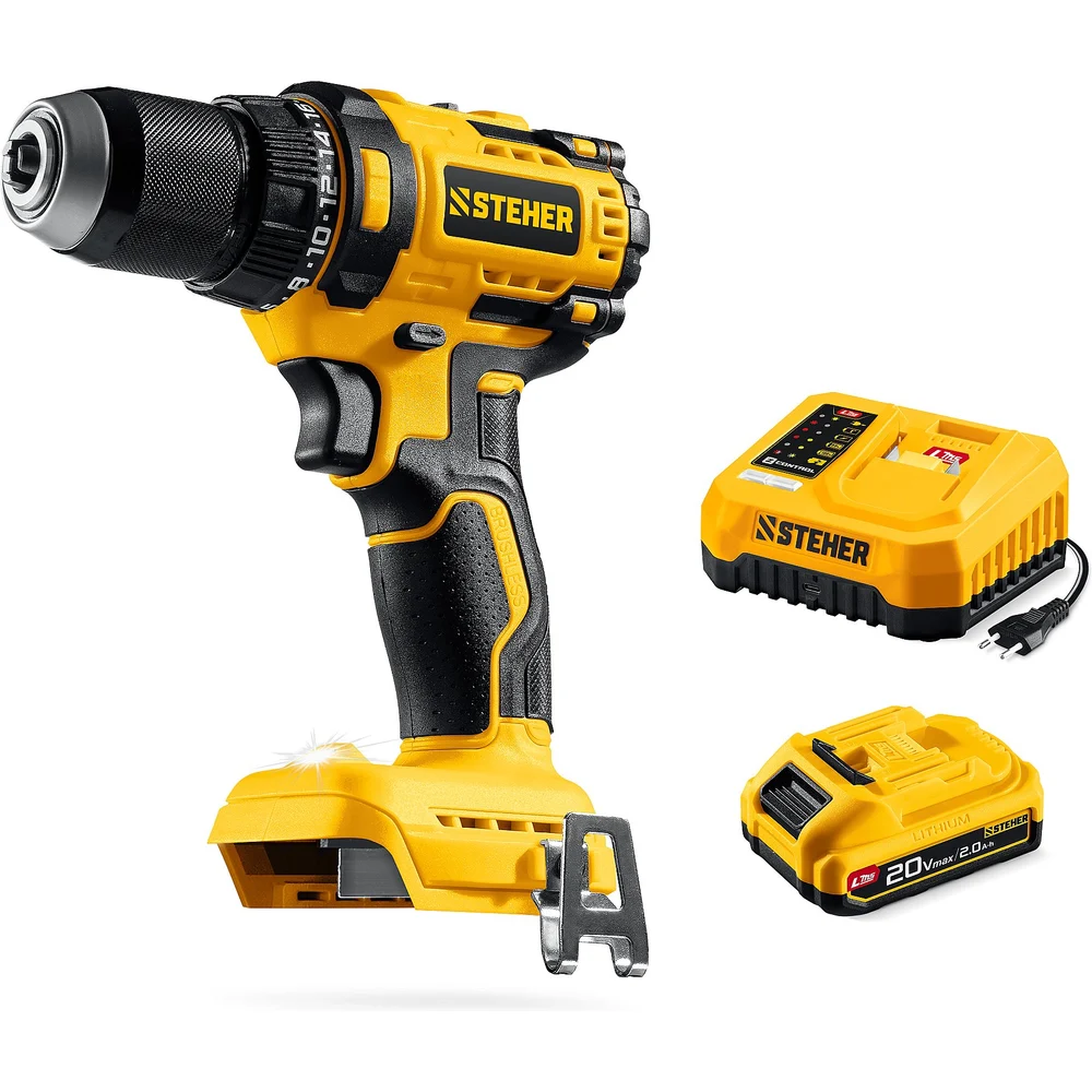 Купить Бесщеточная дрель-шуруповерт STEHER 20 В, 65 Н·м, 1 АКБ LMS (2 А·ч), CB-65-21 по лучшей цене с доставкой - интернет магазин №1 в России