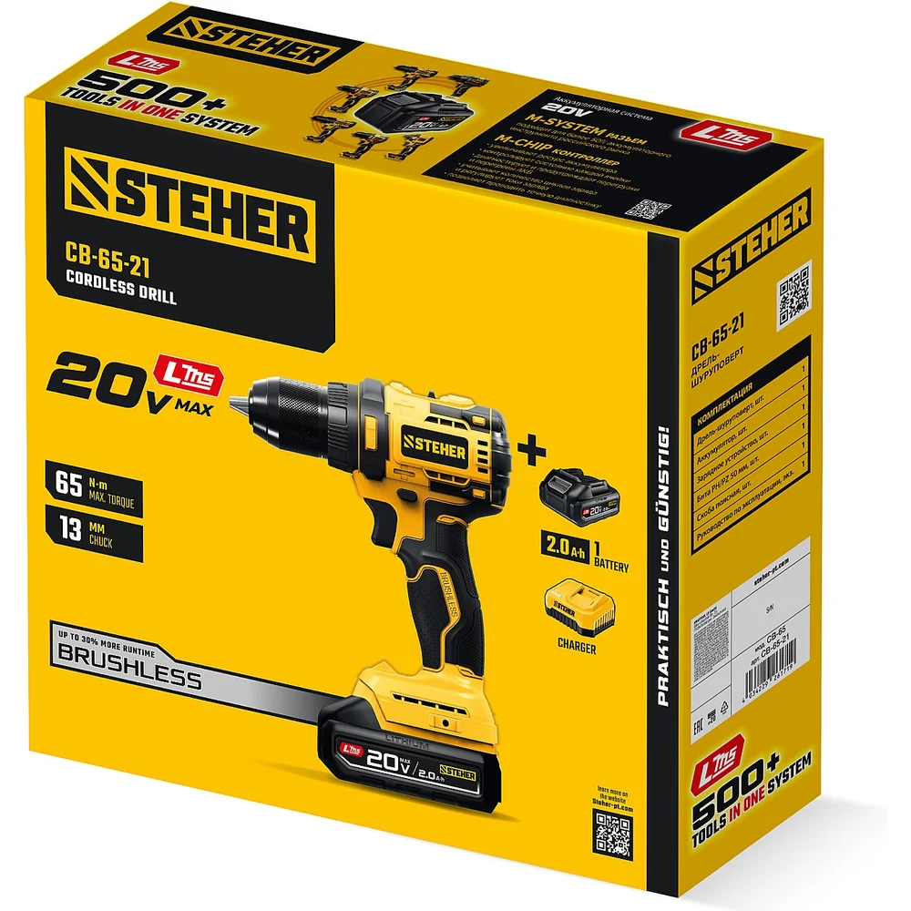 Бесщеточная дрель-шуруповерт STEHER 20 В, 65 Н·м, 1 АКБ LMS (2 А·ч), CB-65-21