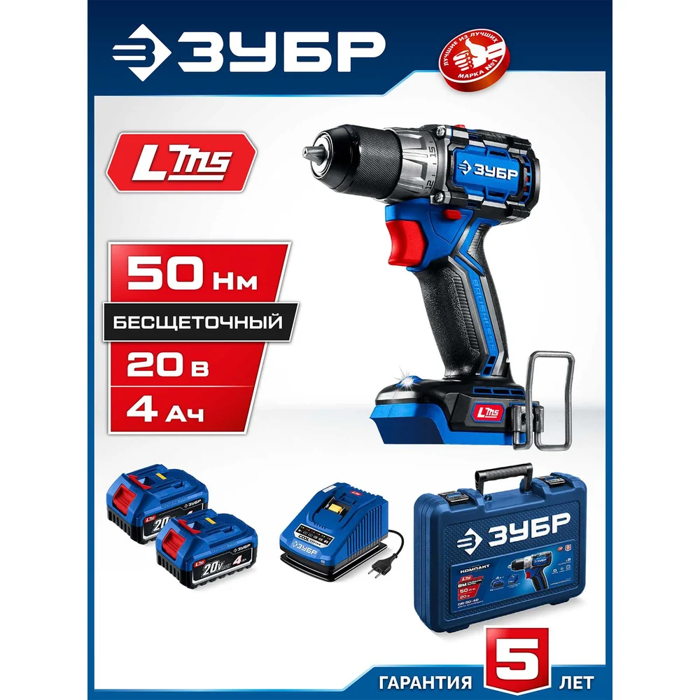 Купить Бесщеточная дрель-шуруповерт ЗУБР Профессионал Компакт 20 В, 50 Н·м, 2 АКБ LMS (4 А·ч), кейс DB-50-42 по лучшей цене с доставкой - интернет магазин №1 в России