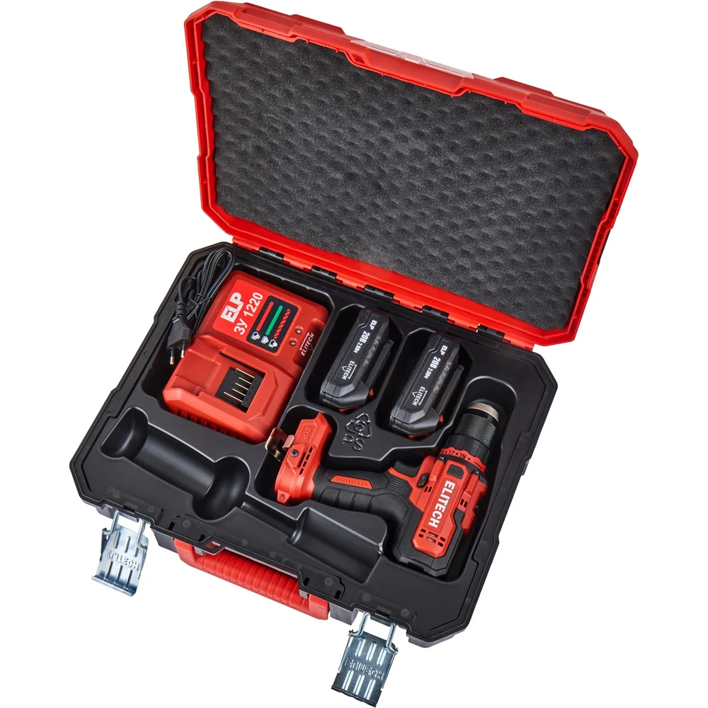 Комплектация Аккумуляторная дрель 1 шт.; Аккумулятор Elitech ELP 20В 2Ач 2 шт.; Зарядное устройство 1 шт.; Паспорт 1 шт.; Кейс 1 шт.