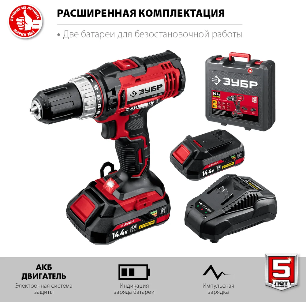 Купить Дрель-шуруповер ЗУБР 14.4 В, 2 АКБ, 2 Ач, в кейсе ДШЛ-145-22 по лучшей цене с доставкой - интернет магазин №1 в России