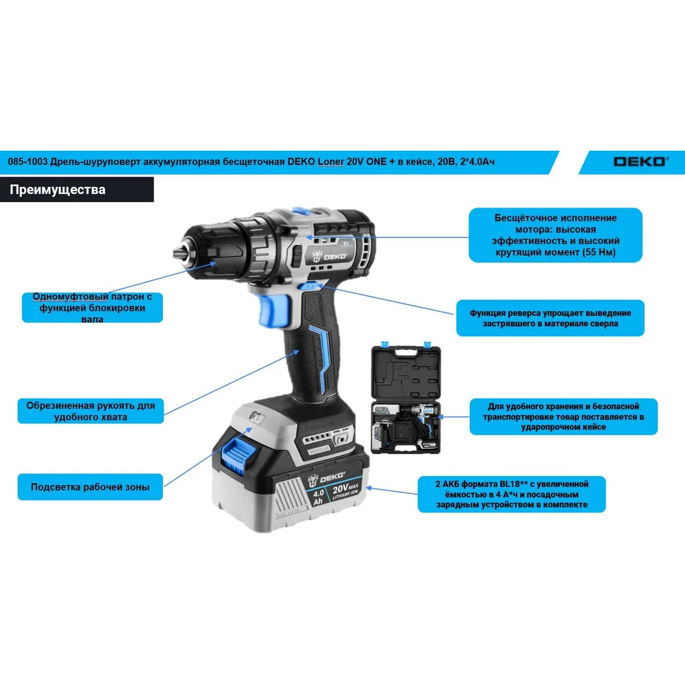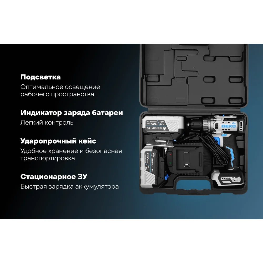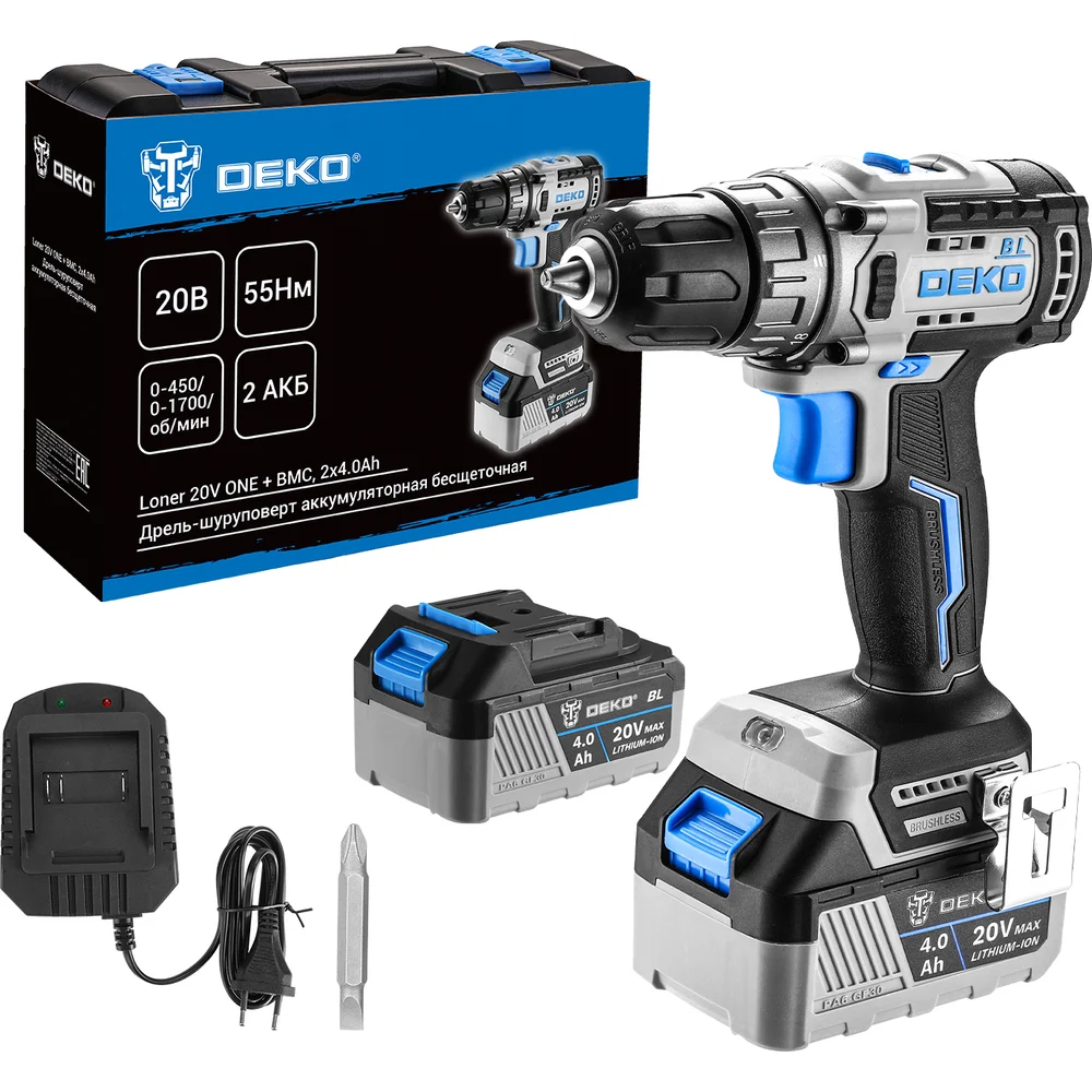 Купить Дрель-шуруповерт аккумуляторная бесщеточная DEKO Loner 20V ONE + в кейсе, 20В, 2x4.0Ач 085-1003 по лучшей цене с доставкой - интернет магазин №1 в России