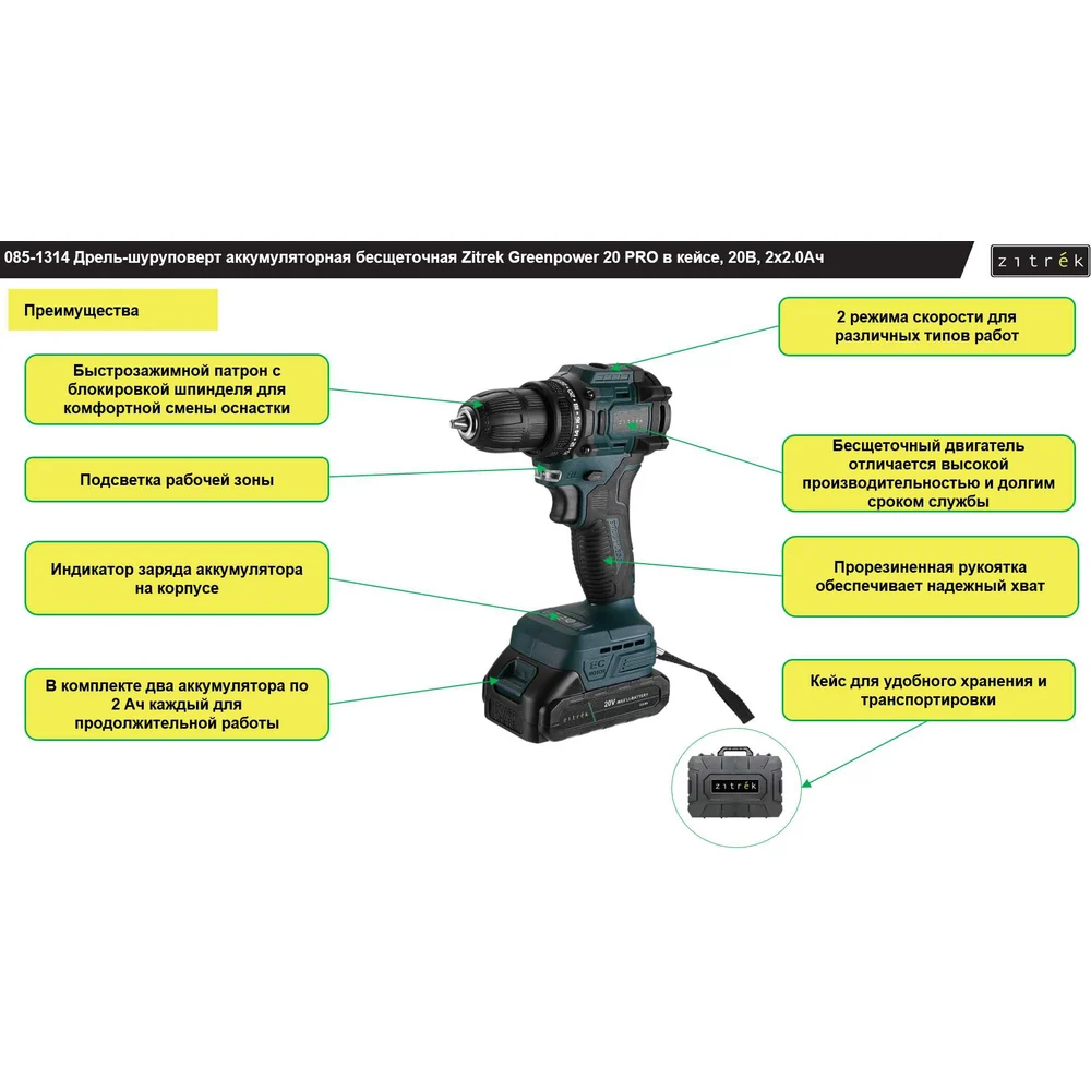 Купить Дрель-шуруповерт аккумуляторная бесщеточная Zitrek Greenpower 20 PRO в кейсе, 20В, 2x2.0Ач 085-1314 по лучшей цене с доставкой - интернет магазин №1 в России