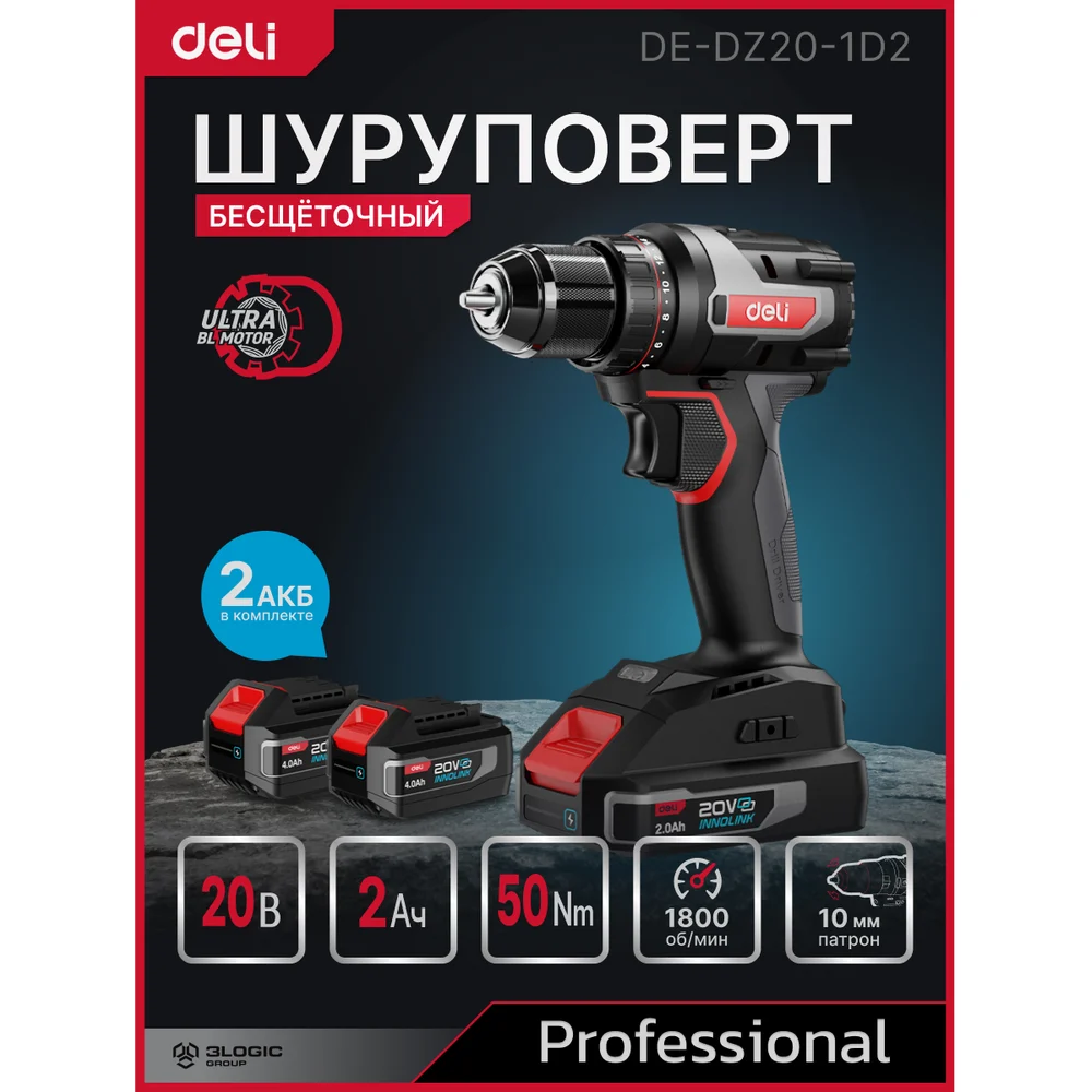 Комплектация Шуруповерт Deli DE-DZ20-1D2; АКБ 20В х 2Ач - 2шт; Зарядное устройство; Сумка; Инструкция/гарантийный талон; Коробка