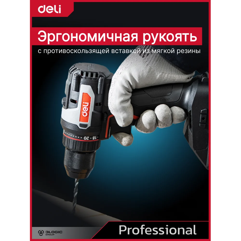 Дрель-шуруповерт аккумуляторная DELI DE-DZ20-1D2 (2 акб, 20В х 2Ач, ЗУ, патрон 10мм, 50Нм, сумка) 164326