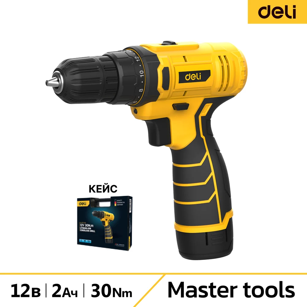 Купить Дрель-шуруповерт аккумуляторная DELI DL-DZ12-5A2 1 акб, 12В х 2Ач, ЗУ, 30 Нм, кейс 164630 по лучшей цене с доставкой - интернет магазин №1 в России