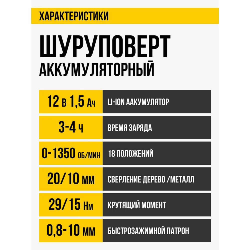 Комплектация Аккумулятор 1,5А·ч - 2 шт; Зарядное устройство - 1 шт; Рулетка 3 м - 1 шт; Бита - 6 шт; Держатель для бит - 1 шт; Руководство по эксплуатации - 1 шт
