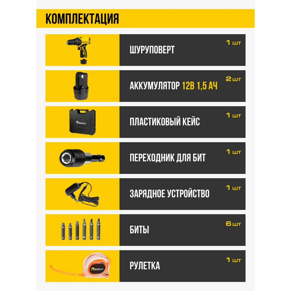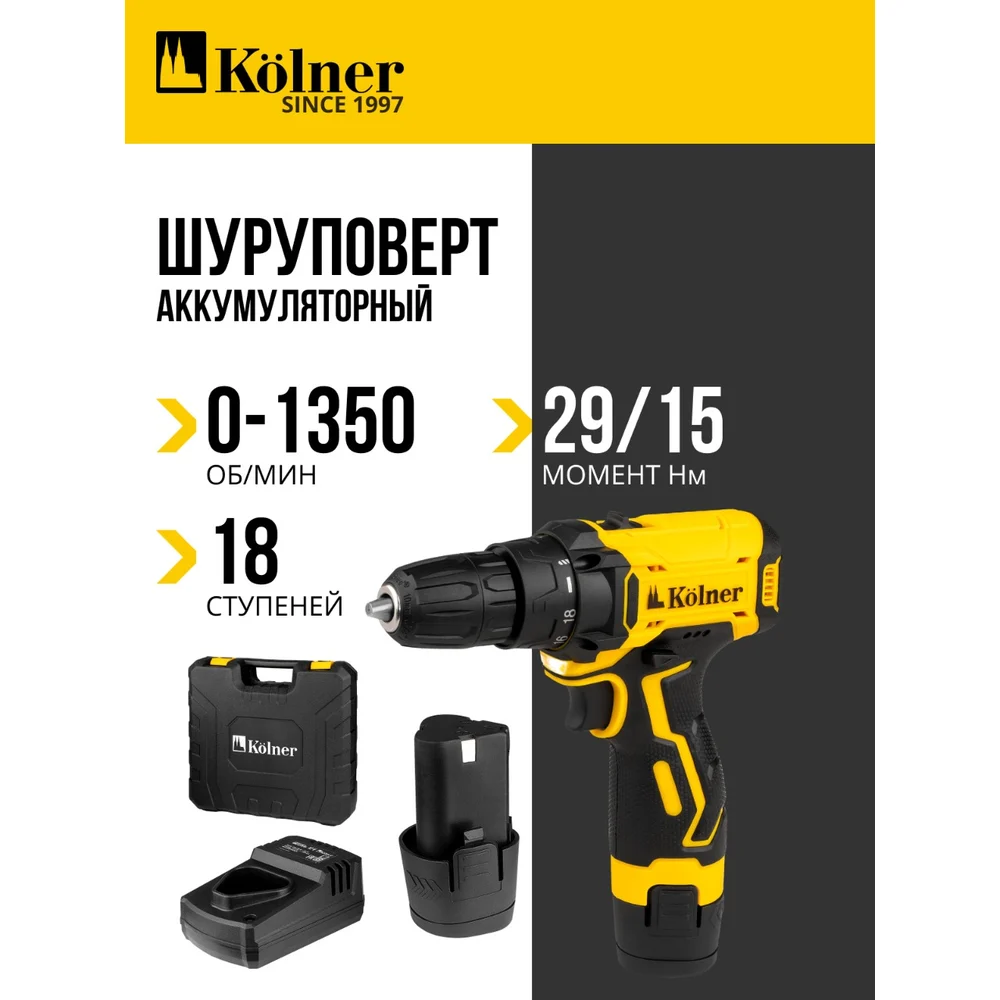 Купить Дрель-шуруповерт аккумуляторная Kolner, 12V, 29Нм, 10 мм KСD 12/2LС (2х1.5Ач, ЗУ, кейс), 8020100584 по лучшей цене с доставкой - интернет магазин №1 в России