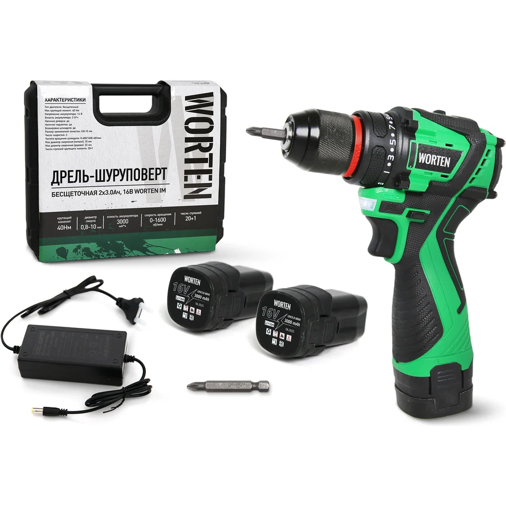 Купить Дрель-шуруповерт бесщеточная WORTEN 2x3.0Ач, 16В IM КА-90000576 по лучшей цене с доставкой - интернет магазин №1 в России