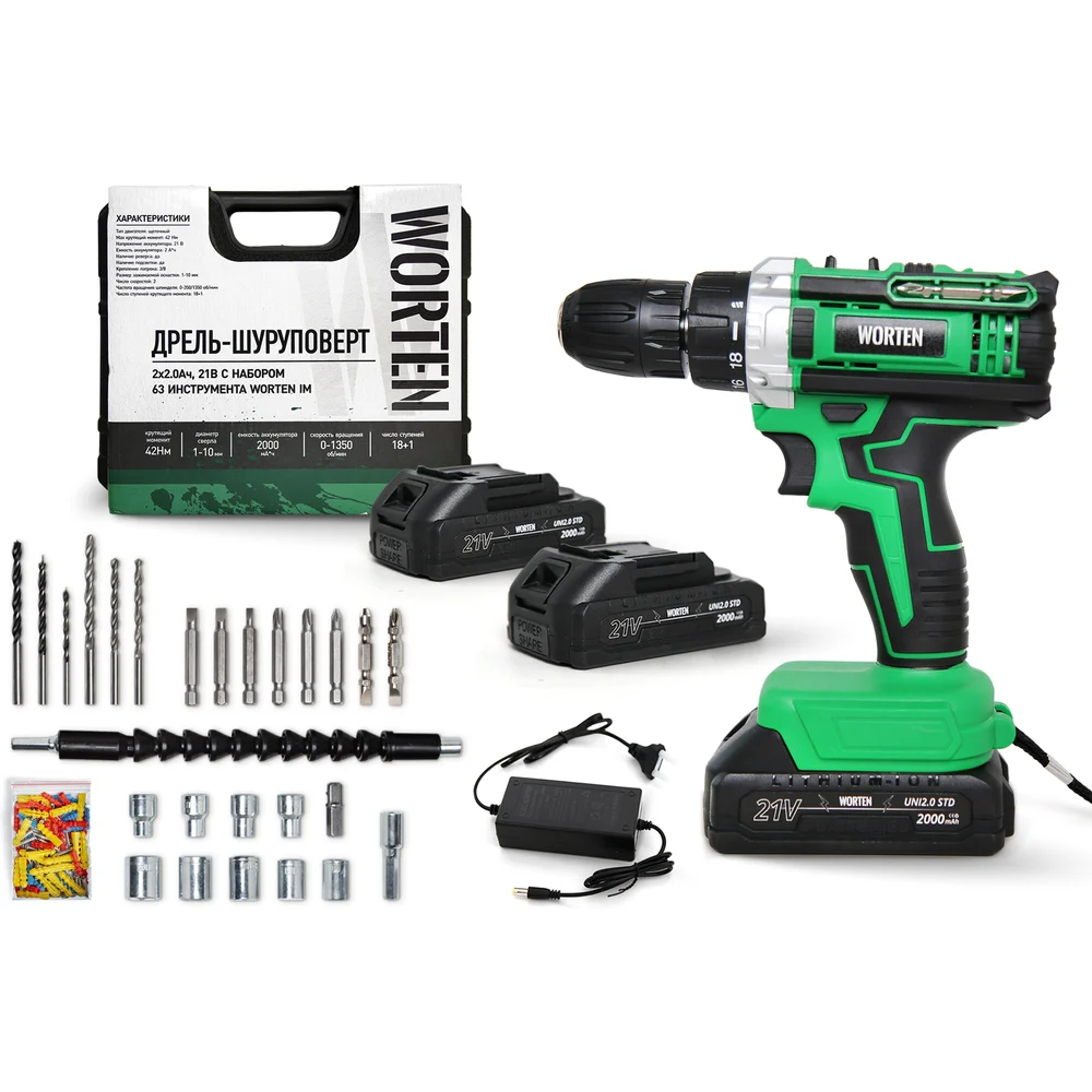 Купить Дрель-шуруповерт WORTEN 2x2.0Ач, 21В, с набором 63 инструмента IM КА-90000574 по лучшей цене с доставкой - интернет магазин №1 в России