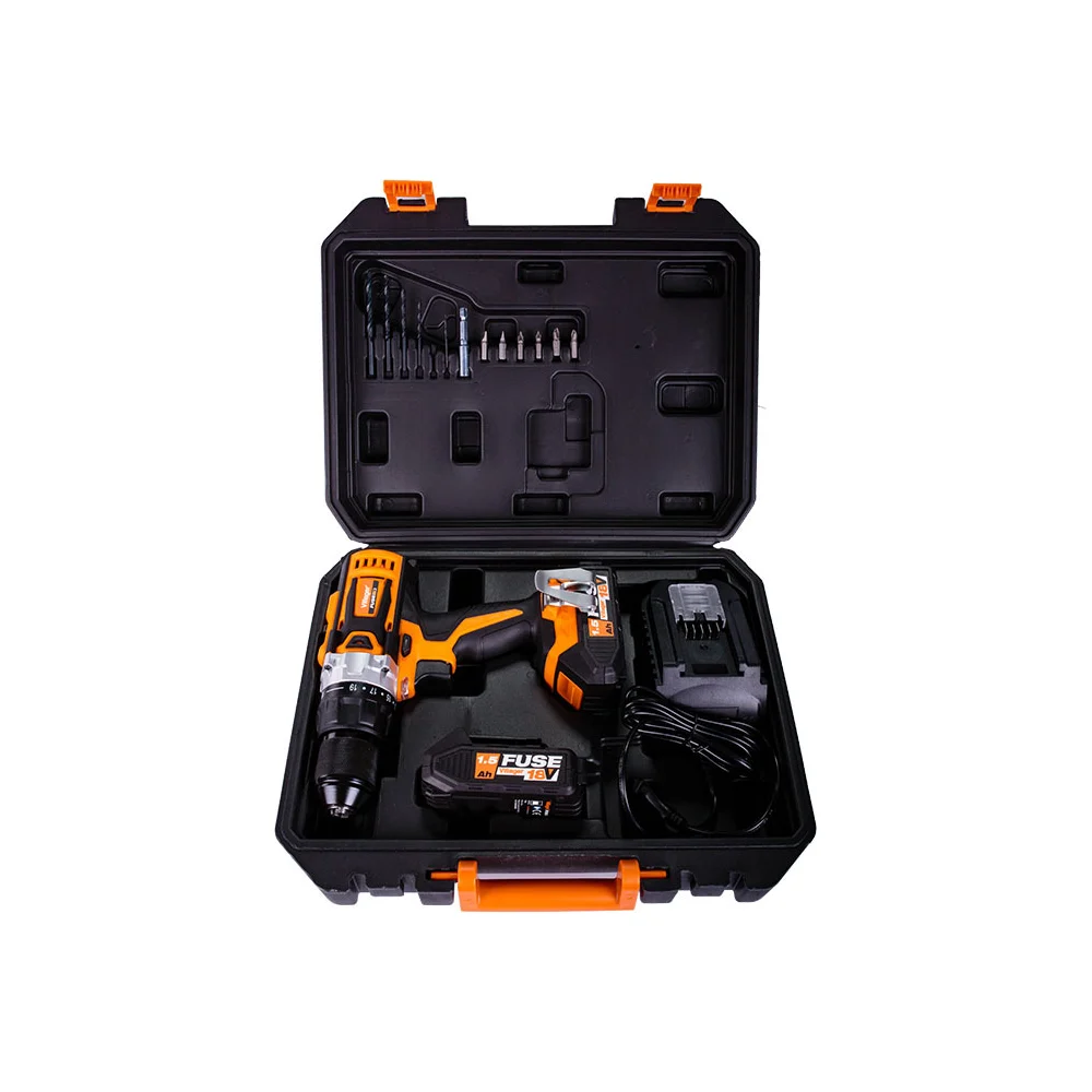 Комплектация Дрель-шуруповерт; Аккумулятор; Зарядное устройство; Набор бит и сверл; Инструкция; Кейс