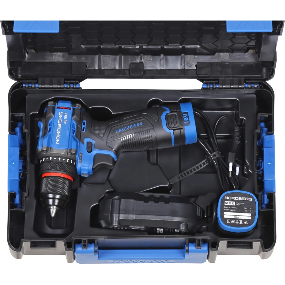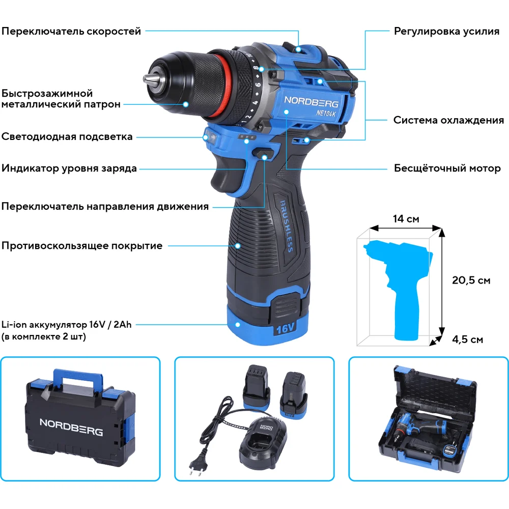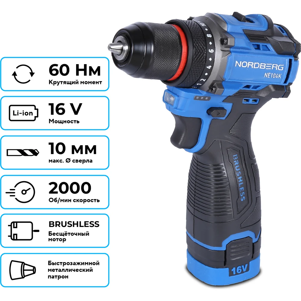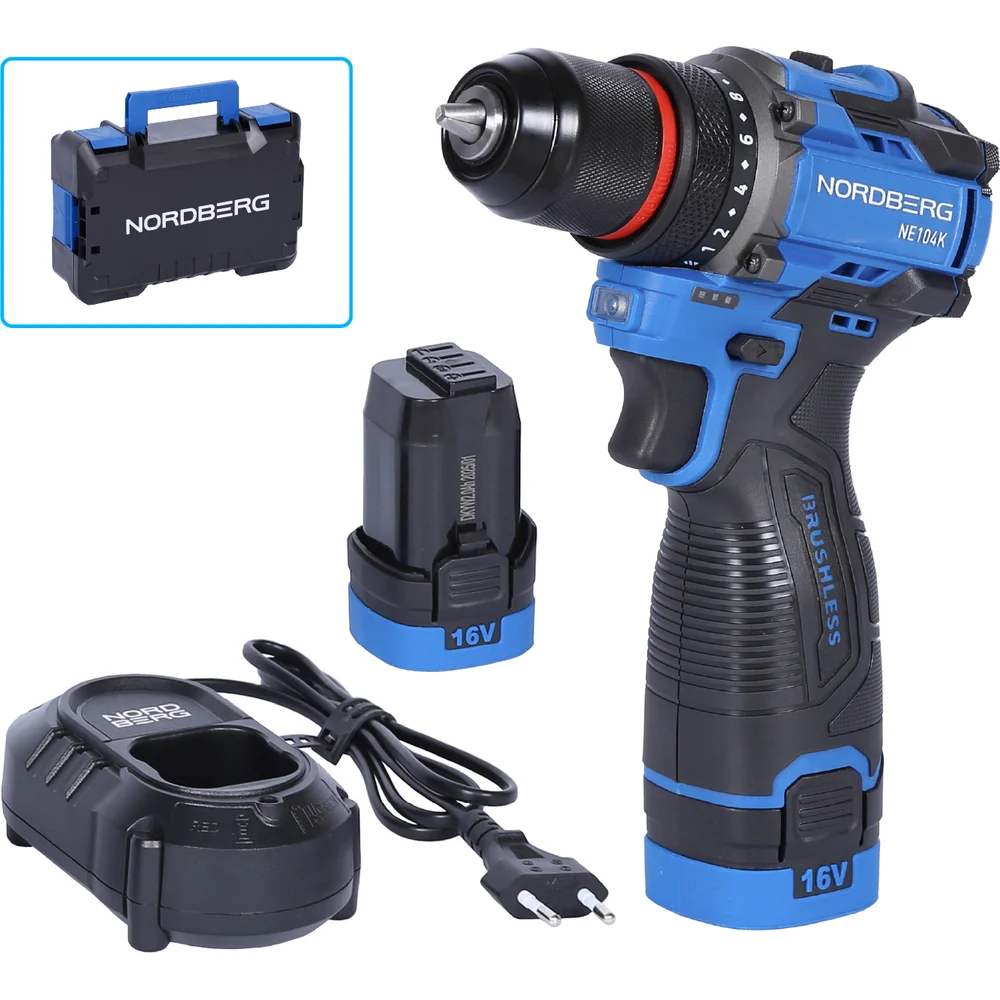 Купить Шуруповерт аккумуляторный NORDBERG макс. диам. сверла 10 мм, 16 В, 60 Нм с 2 аккумуляторами и зарядным уст-вом NE104K по лучшей цене с доставкой - интернет магазин №1 в России