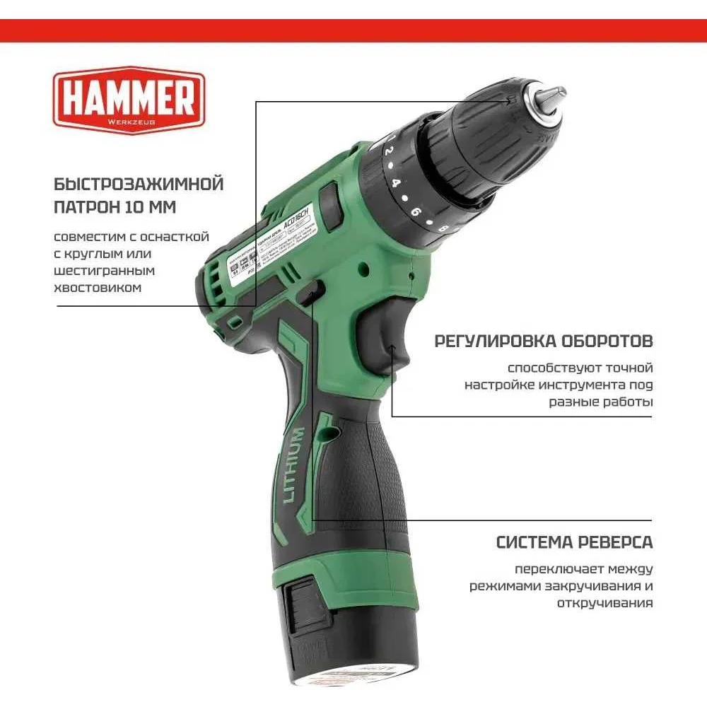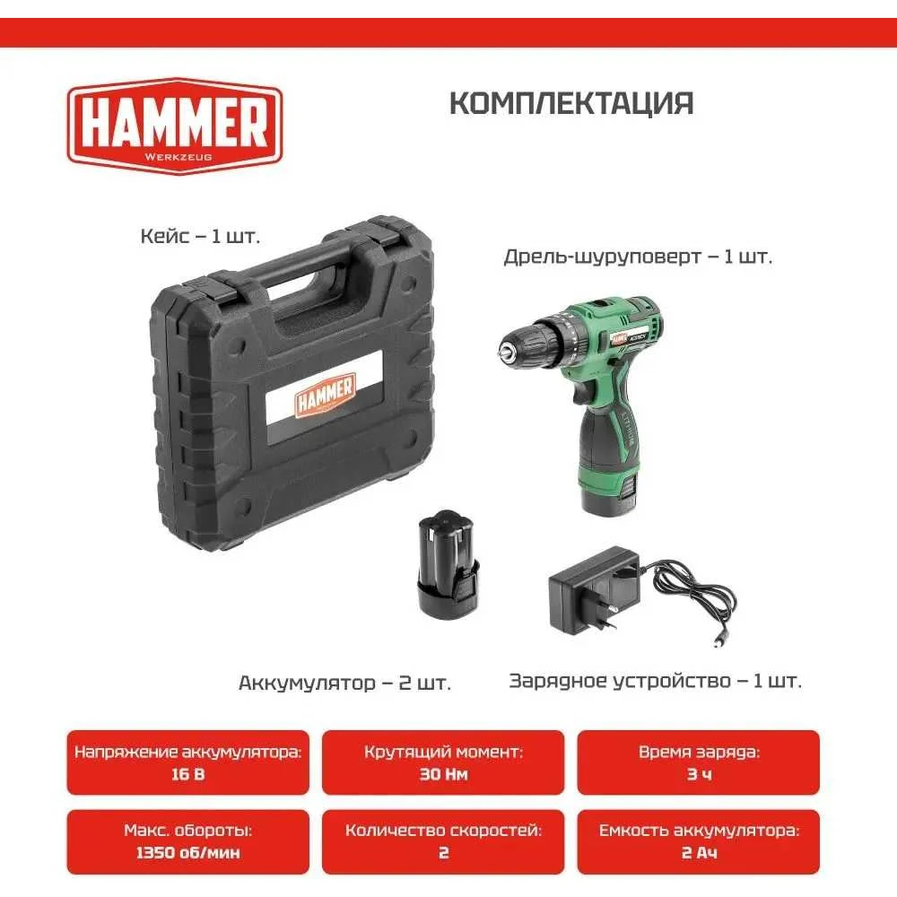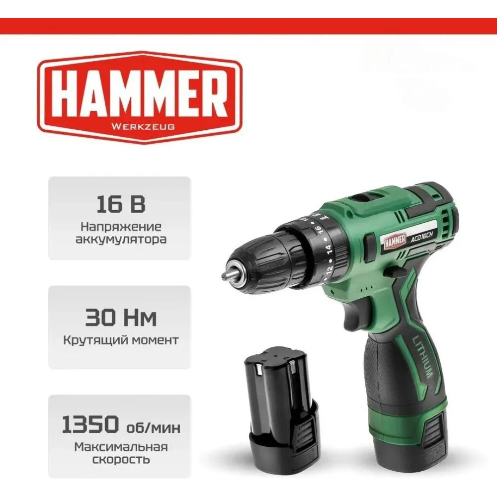 Купить Аккумуляторная дрель Hammer 16в 2x2ач liion 10мм 0-350/0-1350об/мин, 30 нм, кейс ACD16CH 824160 по лучшей цене с доставкой - интернет магазин №1 в России