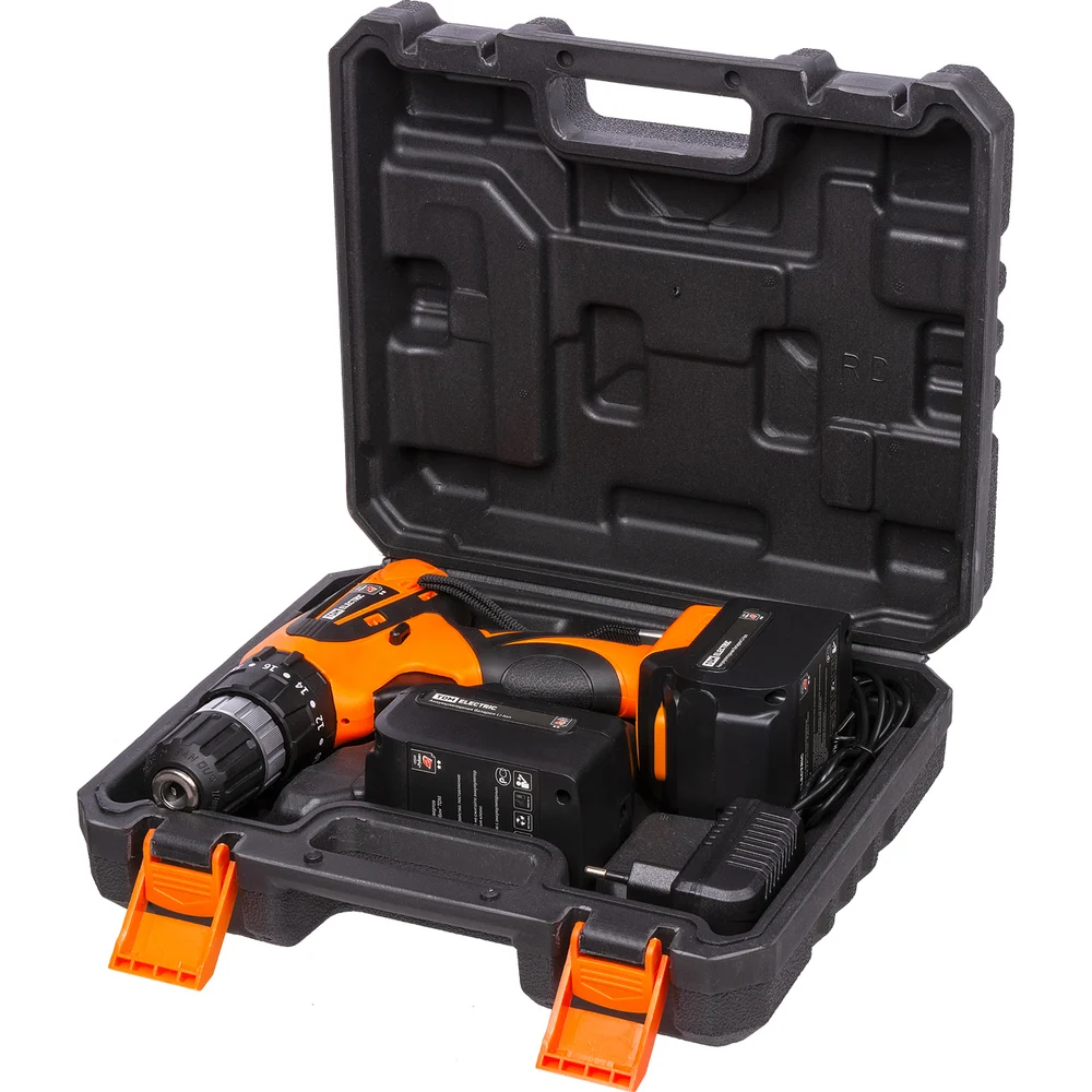 Комплектация Дрель-шуруповерт; Аккумулятор – 2 шт; Зарядное устройство; Руководство по эксплуатации. Паспорт; Пластиковый кейс