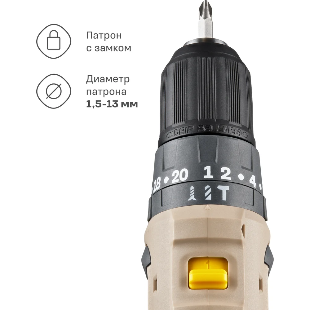 Комплектация дрель-шуруповерт - 1 шт.,; аккумулятор - 2 шт.,; зарядное устройство - 1 шт.,; бита PH 2 50 мм - 1 шт.,; бита PZ 2 50 мм - 1 шт.,; инструкция - 1 шт