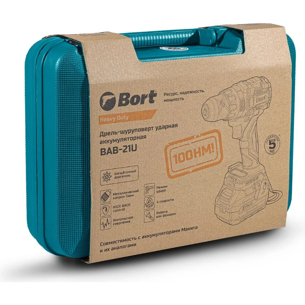 Аккумуляторная ударная дрель-шуруповерт BORT BAB-21U (2x4А.ч) 93414837
