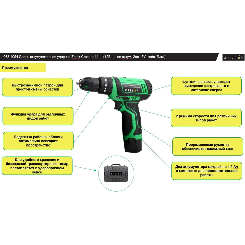 Купить Аккумуляторная ударная дрель-шуруповерт Zitrek Crusher 14-Li 063-4054 по лучшей цене с доставкой - интернет магазин №1 в России