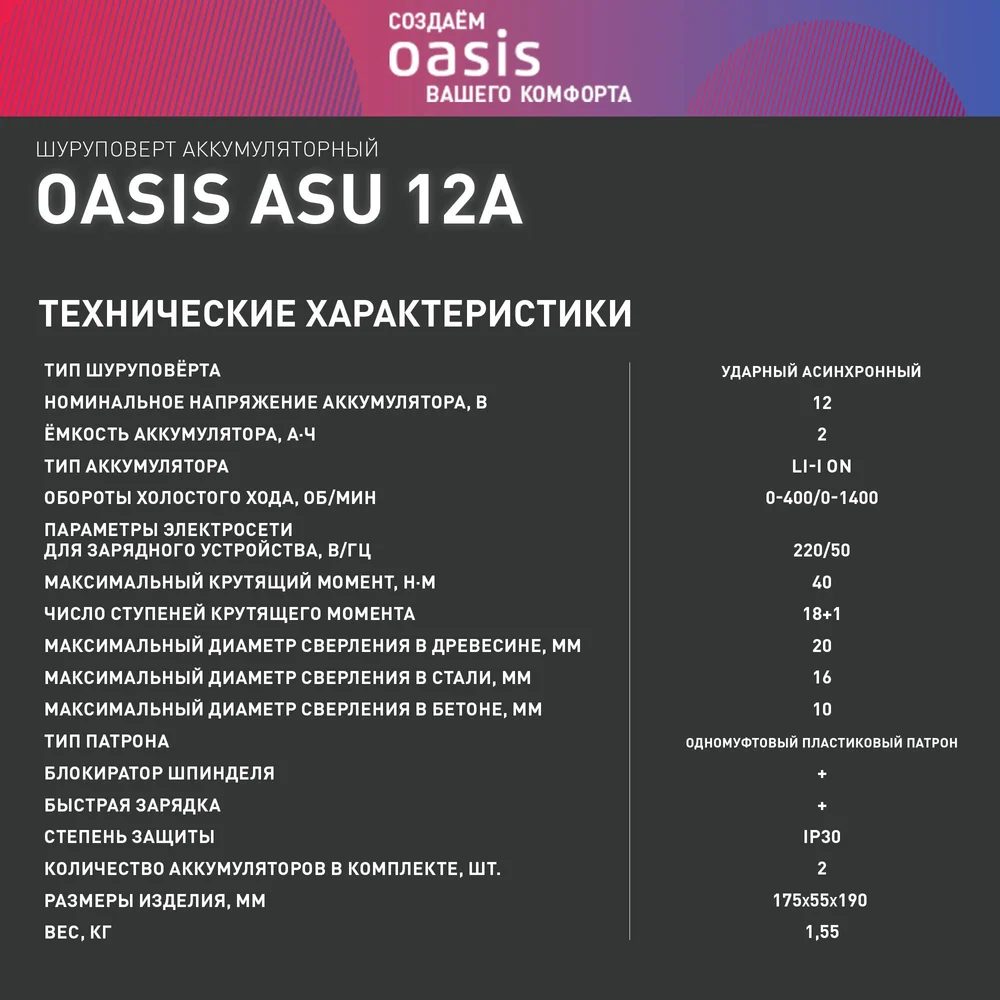 Купить Аккумуляторный шуруповерт OASIS ASU-12A по лучшей цене с доставкой - интернет магазин №1 в России