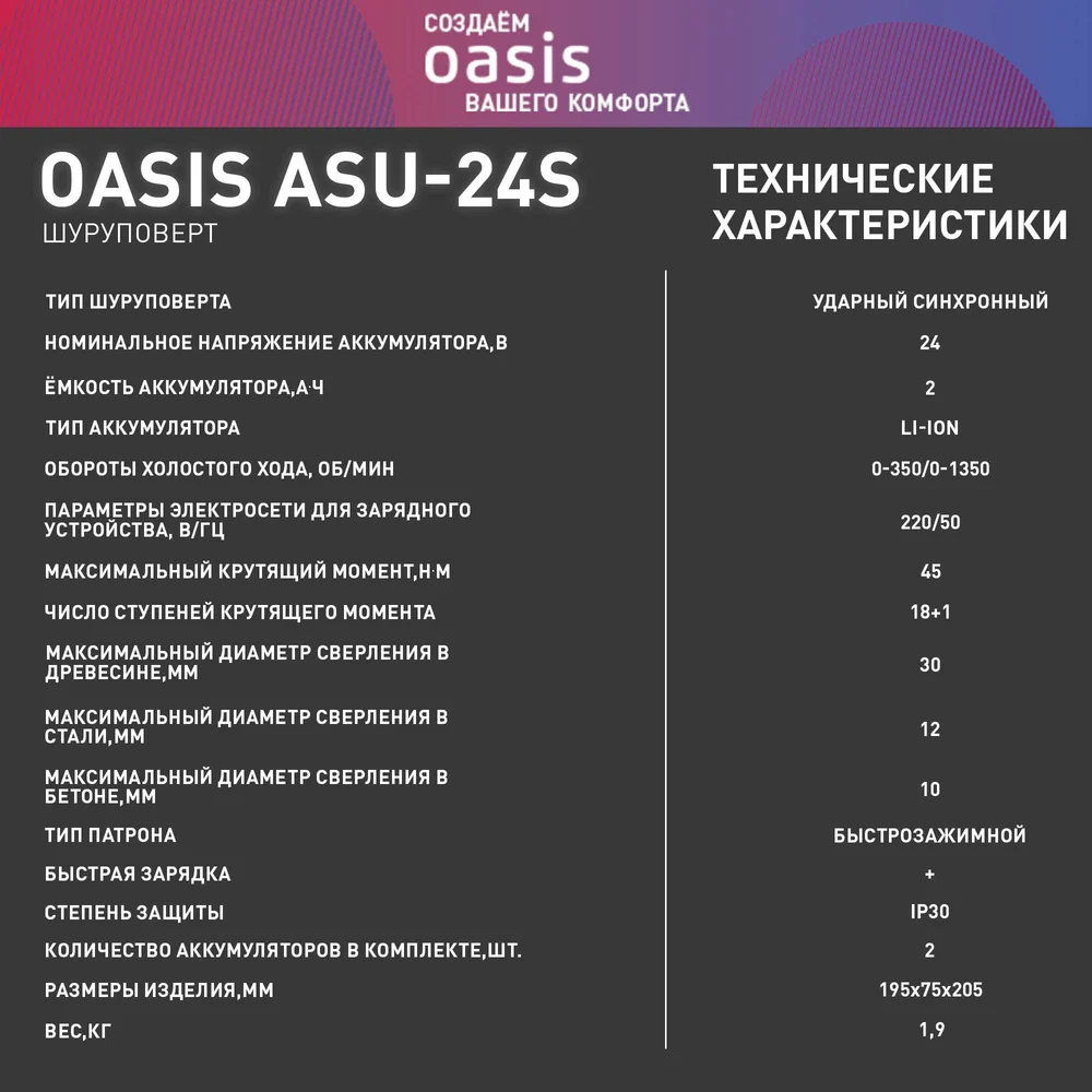 Аккумуляторный шуруповерт OASIS ASU-24S