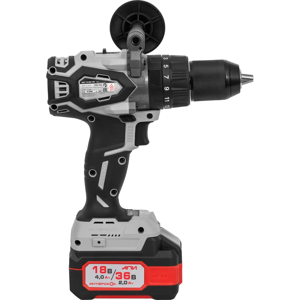 Бесщеточная ударная аккуммуляторная дрель-шуруповерт Интерскол ДАУ-13/36В 140 Li-ion АПИ (кейс, 2 аккум. 2,0Ач, ЗУ) 852.2.2.70