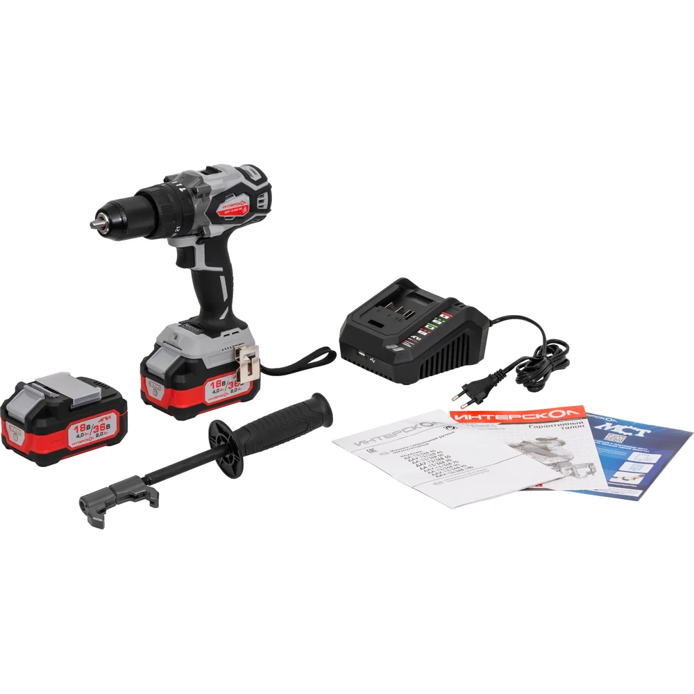 Комплектация Машина ручная электрическая сверлильная аккумуляторная; Устройство зарядное (опционально) -1шт; Батарея аккумуляторная -2шт; Патрон быстрозажимный (установлен на машине); Рукоятка дополнительная; Упаковка индивидуальная кейс; Руководство по эксплуатации и инструкция по безопасности; Гарантийный талон