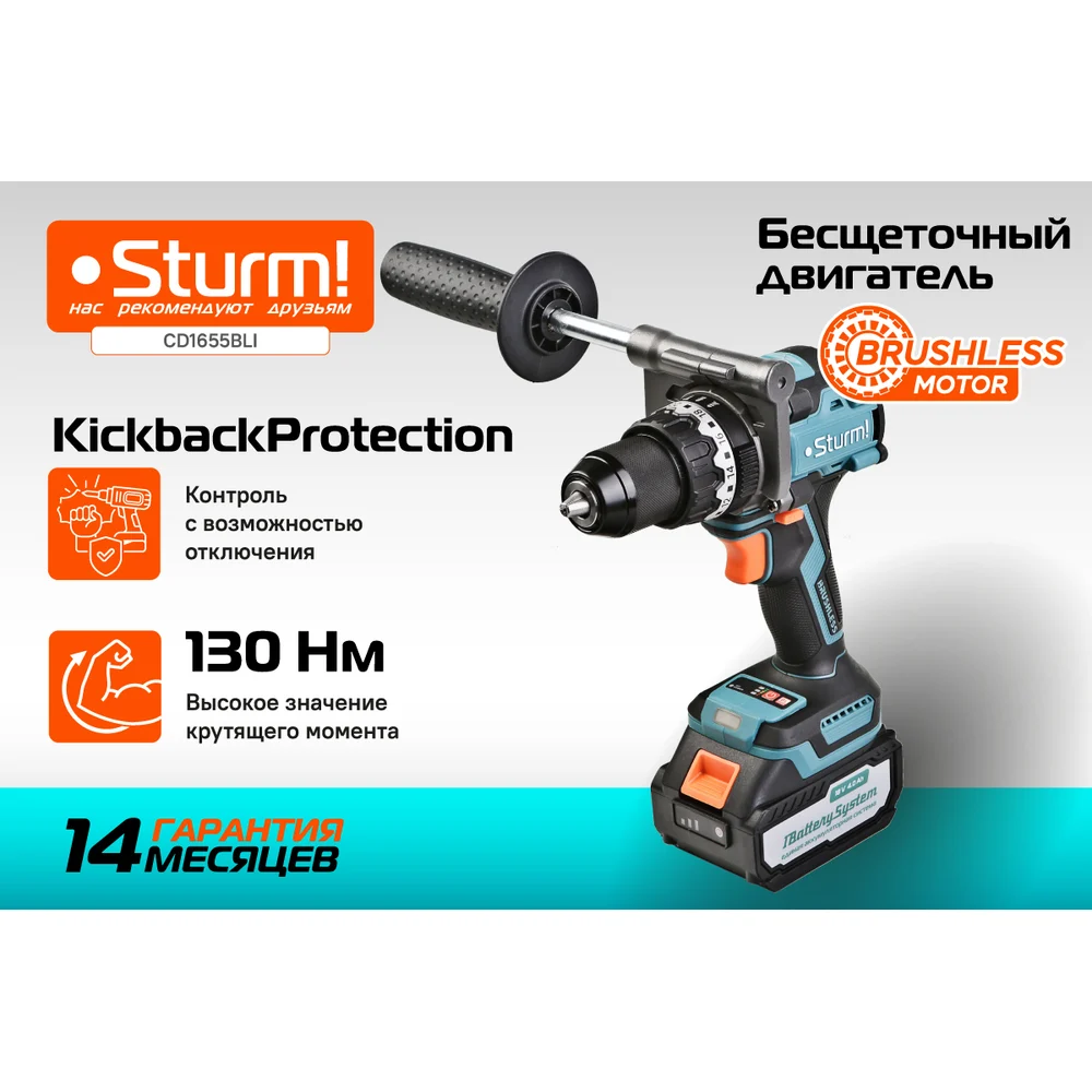 Купить Дрель аккумуляторная ударная Sturm б/щ 18В, 1BatterySystem, 130Нм, 1x4.0Ач, кейс CD1655BLI по лучшей цене с доставкой - интернет магазин №1 в России