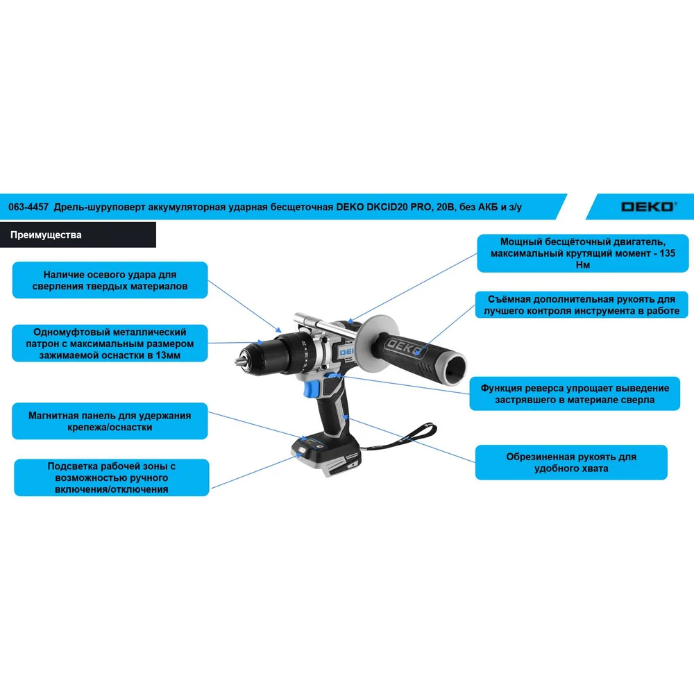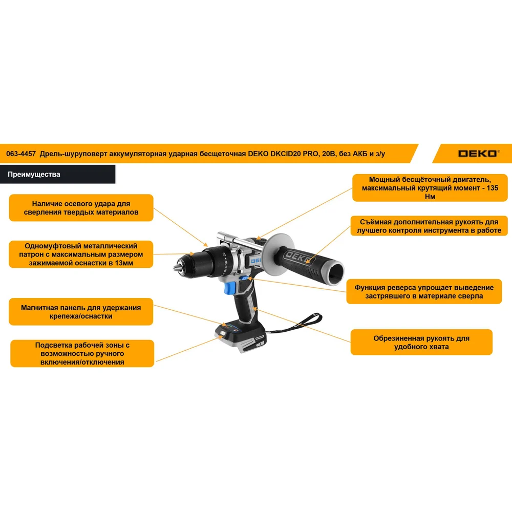 Купить Дрель-шуруповерт аккумуляторная ударная бесщеточная DEKO DKCID20 PRO, 20В, без АКБ и з/у 063-4457 по лучшей цене с доставкой - интернет магазин №1 в России