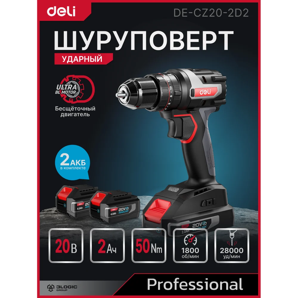 Дрель-шуруповерт аккумуляторная ударная DELI DE-CZ20-2D2 2 акб, 20В х 2Ач, ЗУ, 10мм, 50Нм, сумка 164330