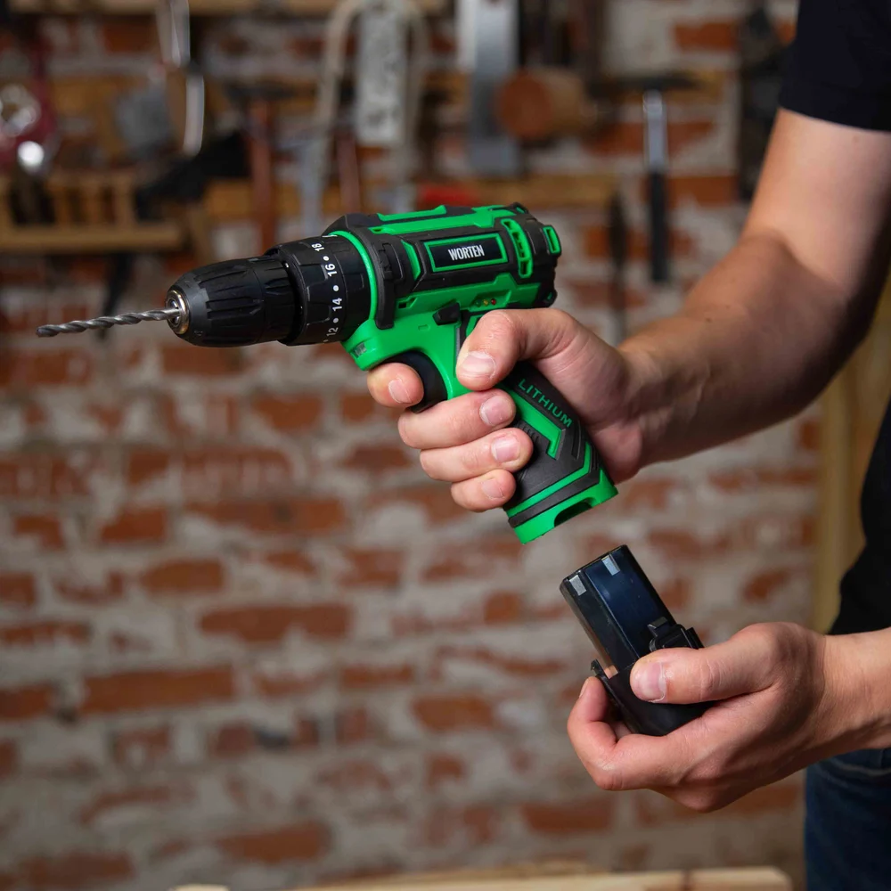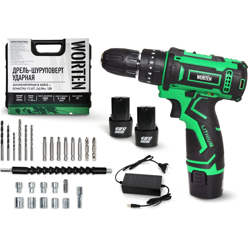 Купить Дрель-шуруповерт ударная аккумуляторная WORTEN в кейсе + оснастка 13 шт, 2x2.0Ач, 12В IM КА-90000580 по лучшей цене с доставкой - интернет магазин №1 в России